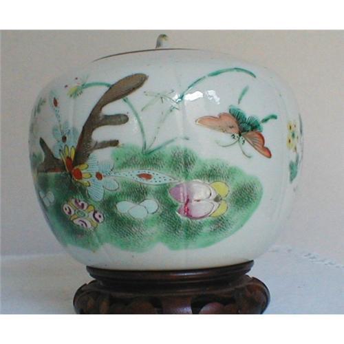 A most interesting and beautifully crafted and painted Qing Dynasty early 19th century FAMILLE ROSE PALETTE ribbed melon jar with handled lid is offered here for the collector of unusual Famille Rose. The figural covered jar has beautiful details of unusual butterflies flitting about fruiting melons and vines. Lid has a raised vine stem as handle.<BR> Totally charming, early and displays beautifully.