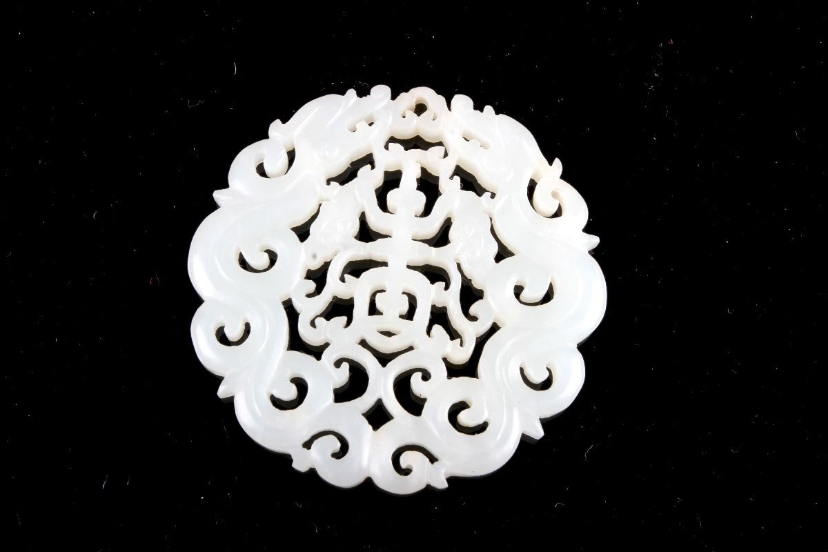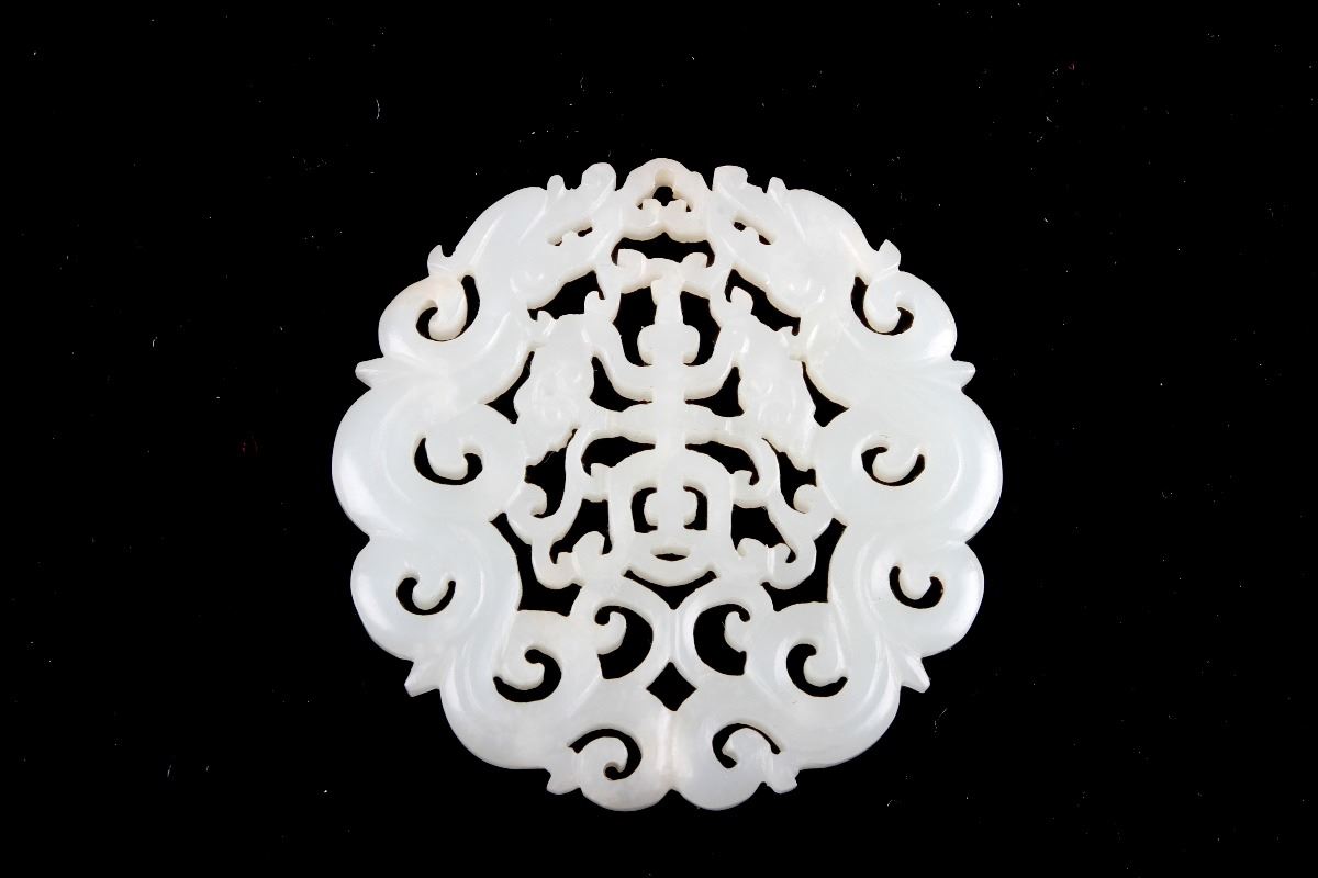 [CHINESE] MID 19TH CENTURY WHITE JADE CARVING PENDANT WITH HOLLOW ENGRAVING CHINESE CHARACTER "FU" (24g) W:2.5"十九世纪中期和田白玉雕镂空“福”纹玉扣(24g)