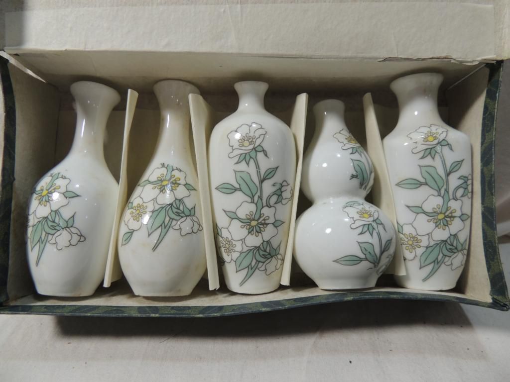 5 MINI VASES FROM CHINA. BUD VASES FROM CHINA AS SHOWN. SEE PHOTO FOR DETAILS.