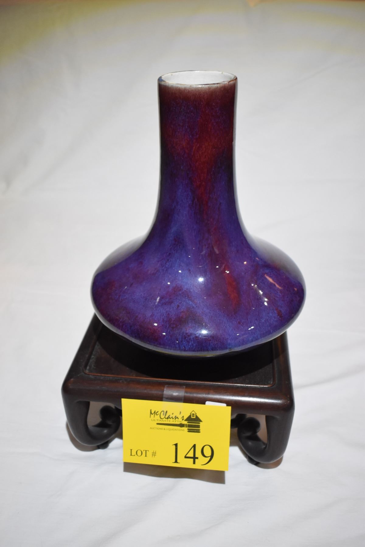 CHINESE MONOCHROME FLAMBE CERAMIC VASE W/HARDWOOD STAND