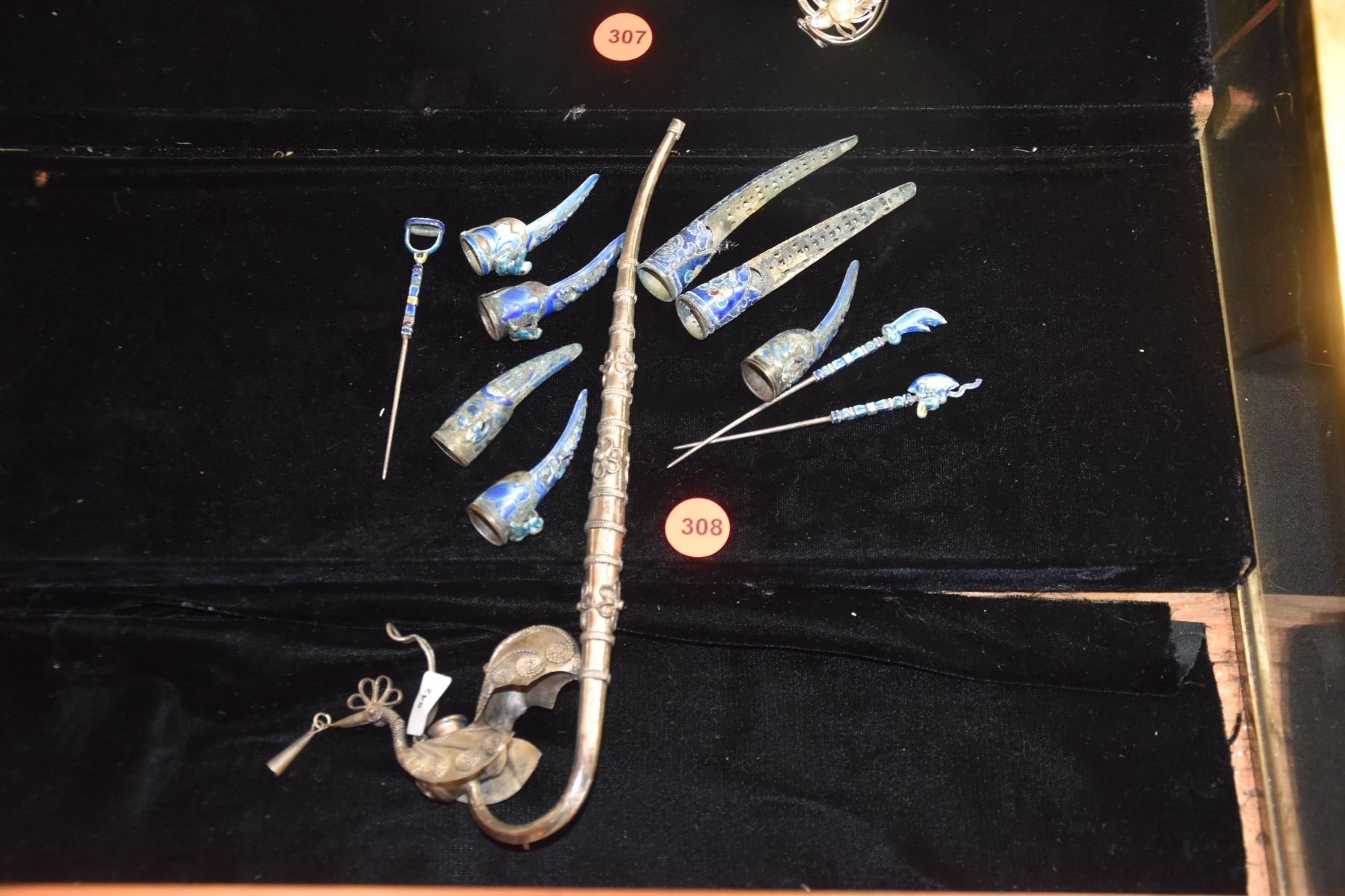 CHINESE NAIL SHIELDS, HAIR PINS & PIPE (11 PCS)