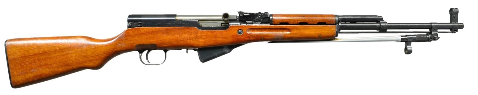 A beautiful example of Chinese rifle variant marked w/ factory code “26" (in triangle). Imported through Interstate Arms, Billerica, MA. Blued finish on all exposed metal surfaces w/ matching numbers on obvious parts including receiver, mag., top cover, bolt carrier & even the stock. Hooded front sight. Rear tangent sight adj. to 1000m. Hardwood stock in red tinted finish, complete w/ trapdoor & cleaning kit. Cleaning rod also present beneath bbl. Triangular spike bayonet. CONDITION: all exposed metal surfaces enjoy complete coverage w/ a few dings & scratches upon close examination. Stock has a few light impressions typical of these particular rifles. Still retains traces of cosmoline indicative of seeing very little use. Shiny bore w/ strong rifling. Fire control mechanism appears to function correctly when cycled by hand. (22-4162/JZ). CURIO. $300-400.