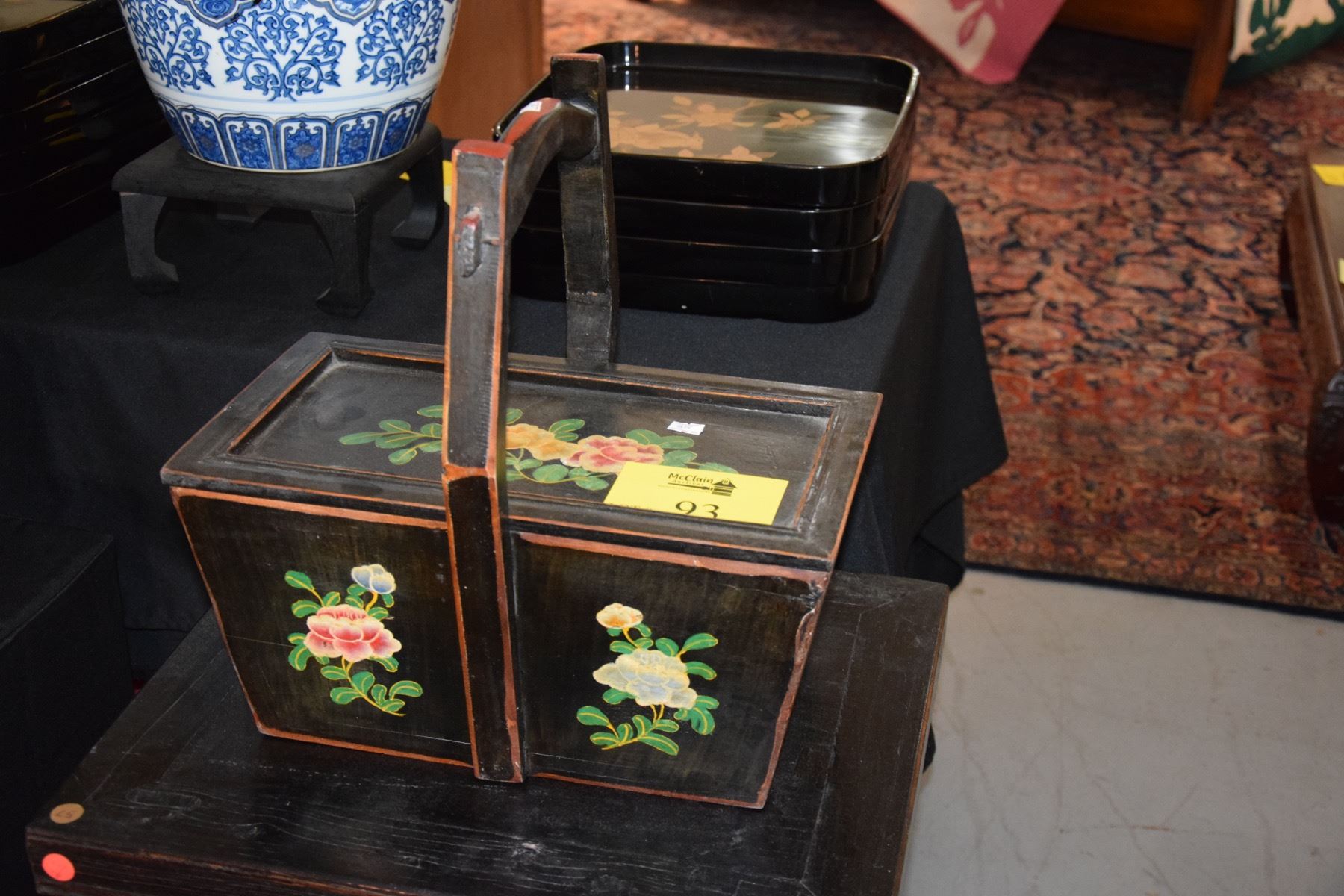CHINESE PAINTED WOODEN FLOWER BASKET (COVERED)