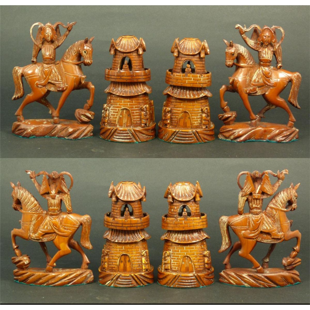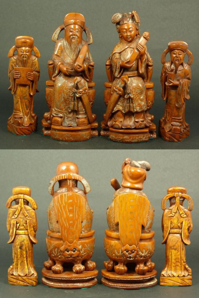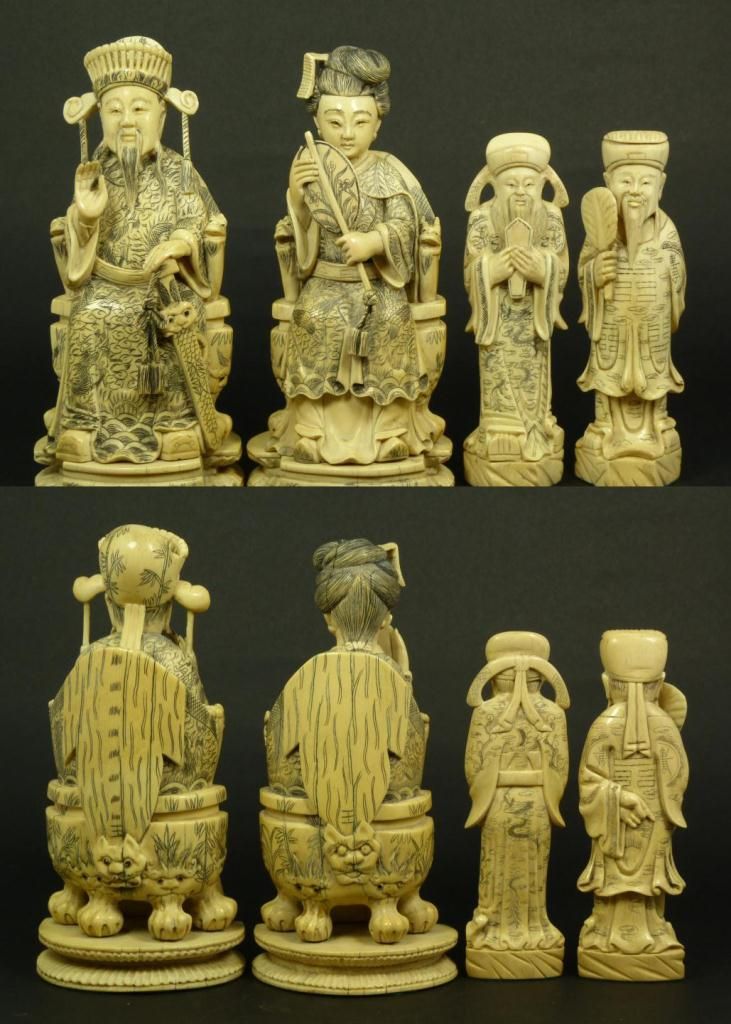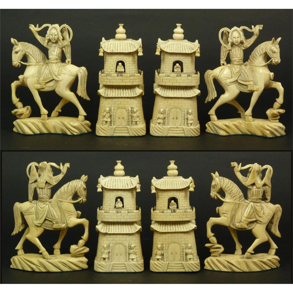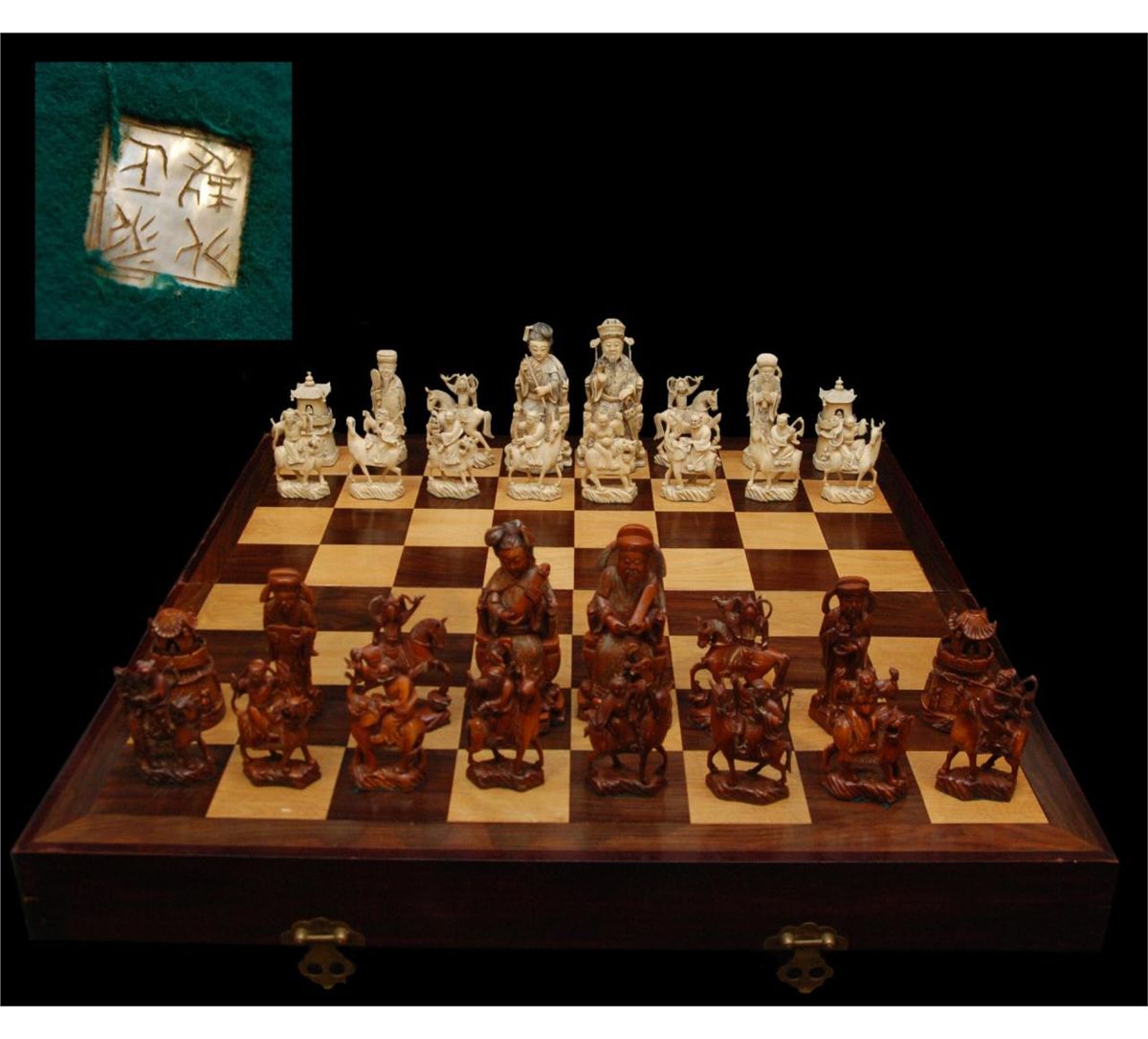 An antique stunning palace sized chess set with fitted box. Each piece is finely carved and signed with calligraphy to bottom. Emperor and Empress figures hold mother of pearl plaque to bottom with reign marks. Set has natural and tea stained colors. Pawn pieces depict the 8 immortals on various animals. The rooks are pagodas. The knights are warriors on horseback. The bishops are wisemen. The king and queen are depicted as Emperor and Empress seated on dragon and phoenix thrones. Mid to Late Qing dynasty period (18th/19th century). Smallest piece measures 4 1/4" height (10.7cm). Largest piece measures 7 1/2" height (19.1cm). Total weight of approx. 50 pounds including box.