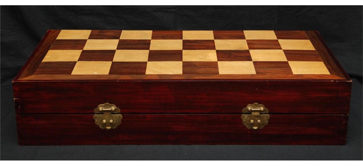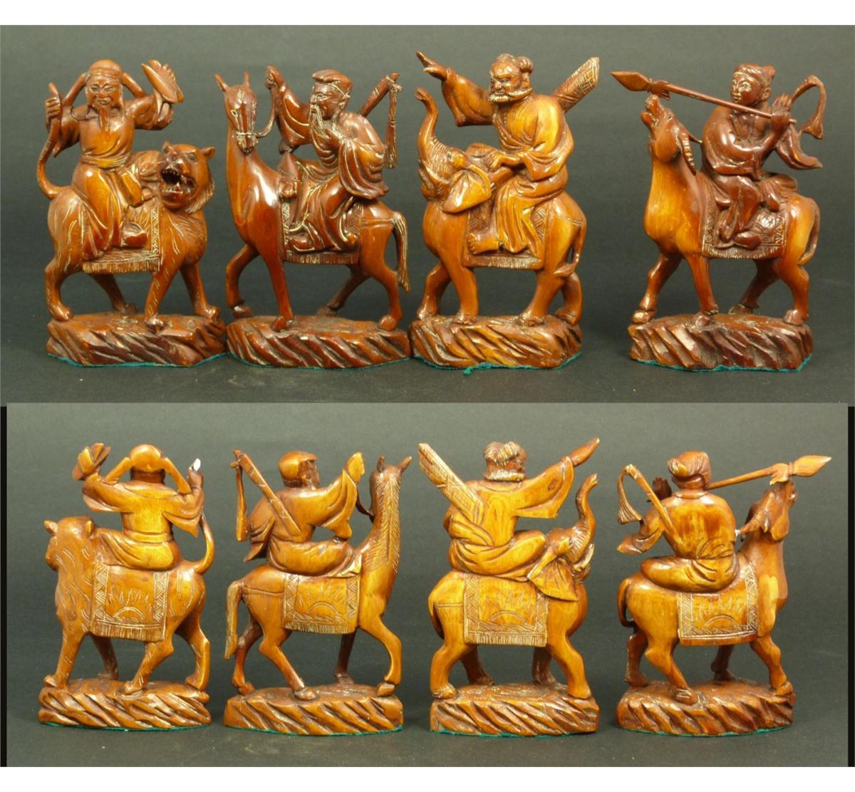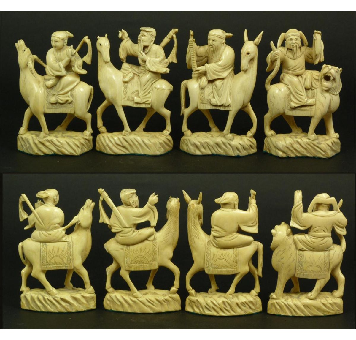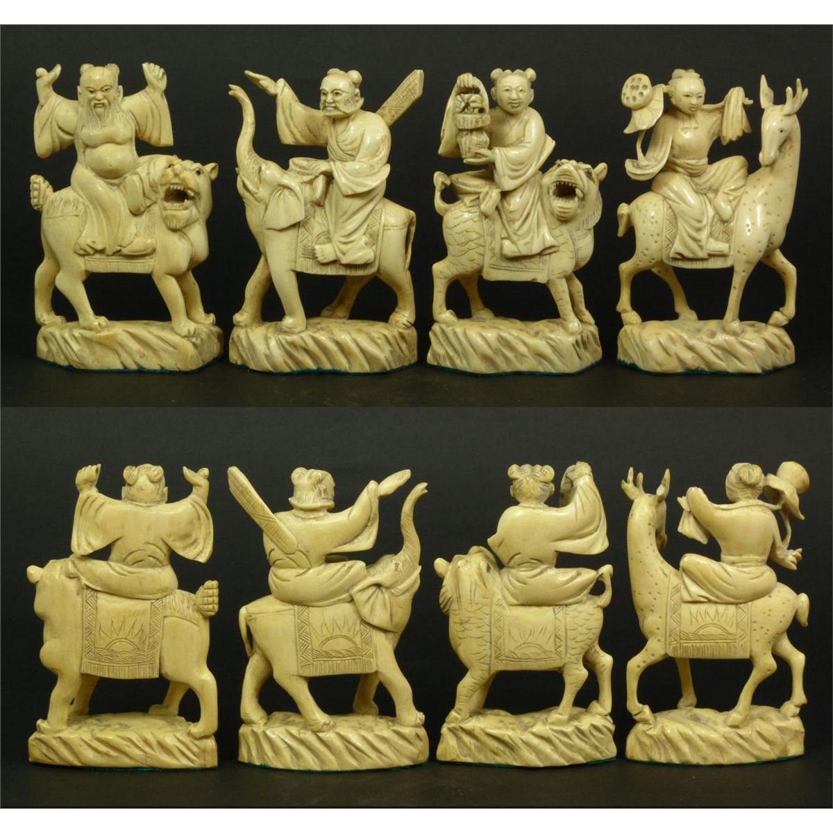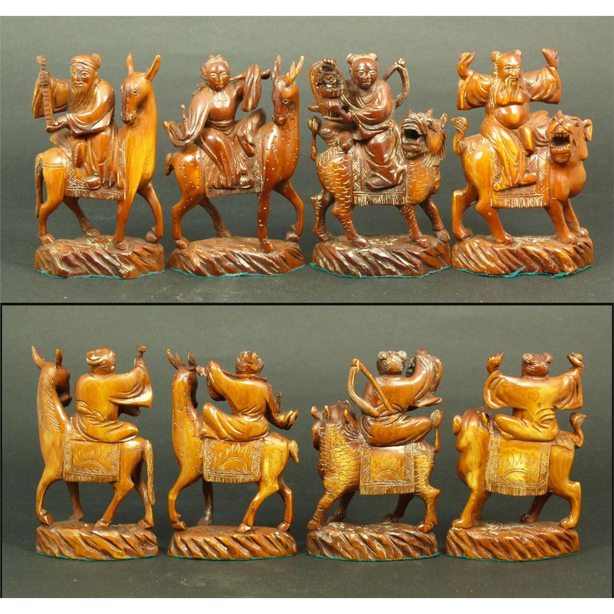 An antique stunning palace sized chess set with fitted box. Each piece is finely carved and signed with calligraphy to bottom. Emperor and Empress figures hold mother of pearl plaque to bottom with reign marks. Set has natural and tea stained colors. Pawn pieces depict the 8 immortals on various animals. The rooks are pagodas. The knights are warriors on horseback. The bishops are wisemen. The king and queen are depicted as Emperor and Empress seated on dragon and phoenix thrones. Mid to Late Qing dynasty period (18th/19th century). Smallest piece measures 4 1/4" height (10.7cm). Largest piece measures 7 1/2" height (19.1cm). Total weight of approx. 50 pounds including box.