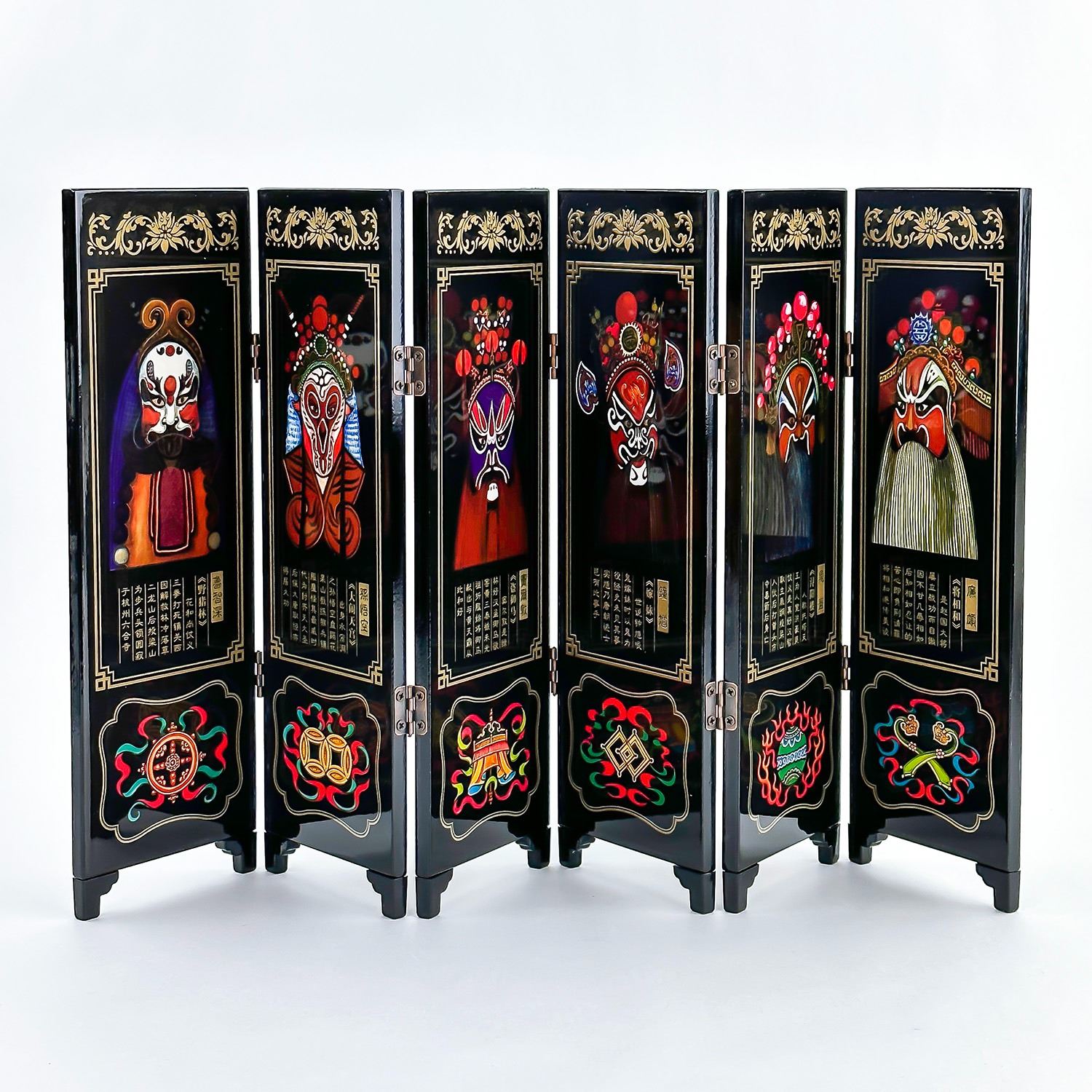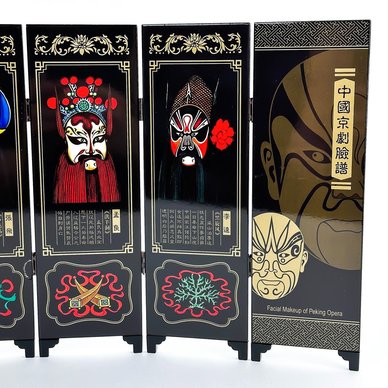#8033 - AN IMITATION OF AN ANCIENT SMALL SCREEN. SCREEN DEPICTS THE FACIAL MAKEUP OF CHINESE PEKING OPERA. UNFOLDED SCREEN MEASURES: 18.5” (47 CM) LONG BY 9.5” (24 CM) HIGH