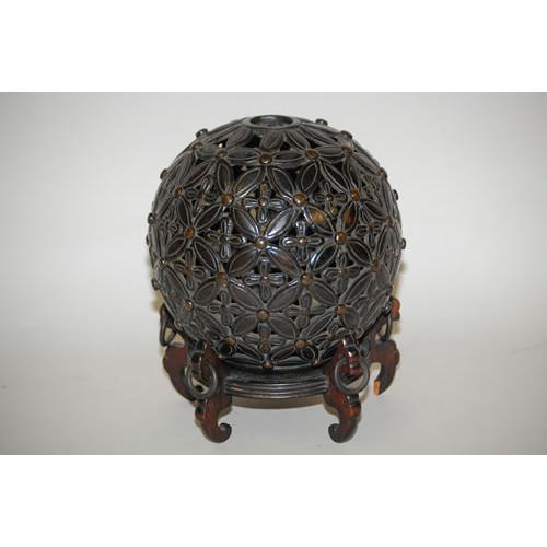 CHINESE PIERCED BRONZE SPHERE - 19TH-EARLY 20TH CENT.<BR>CHINESE OPEN WORK SPHERE OF LINKED FLORAL FORMS ON A<BR>TEAKWOOD STAND W/ IRON RINGS (PERHAPS A DECORATIVE<BR>CANDLE SHADE)(9 1/2" T X 8" W) - PAINTA, WEAR,<BR>IMPERFECTIONS