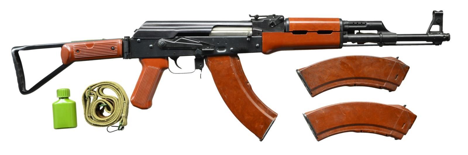 Cal. 7.62x39mm. S# PS87-02758. Bbl. 16” threaded w/ thread protector. The ultimate in 1980s gun culture were the Chinese mfg. AK47 variants that were once so plentiful & inexpensive. The highest quality & most sought after variants were mfg. by Polytech & imported in numerous configurations. As their popularity increased in the United States w/ shooters & collectors and the availability of the once rare 7.62x39mm ammunition improved, we were faced w/ the first of numerous pieces of legislation dealing w/ the propaganda push of the day & firearms w/ similar attributes were branded “assault weapons” & eventually heavily restricted. One of the first new restrictions regarding the semi automatic versions to go into effect was mandated by executive order w/out legislative involvement & banned the importation of guns that didn't qualify as having a sporting purpose. One of the most noticeable & popular functional features is the side folding metal stock. This particular example is a textbook piece w/ its reddish brown plastic furniture, still in factory packaging as it left China. Stamped receiver. Hooded front sight post & rear sight adj. in elevation to 800m. Safety selector on right side of receiver. Receiver marked on left w/ "386" inside oval, & "MODEL AKS-762 / CAL. 7.62X39MM / SEMI-AUTO / POLY TECH / BEIJING, CHINA". Bottom of receiver, in front of mag well marked; "IMPORTED BY / K F S / ATLANTA GA / MADE IN CHINA". MAGS: 3 Brown Bakelite 30 rd. factory. UNATTACHED ACCESSORIES: factory box w/ styrofoam insert, & components as shipped from Polytech including green canvas sling, tan canvas sling, plastic oil bottle, & magazines. CONDITION: all outward appearances indicate that this particular example may have been removed from its factory packaging only for display & occasional light fondling. We received it in its original styrofoam lined cardboard box. Finish coverage is complete w/ only thinning between safety & receiver, which happens almost immediately. Fire control mechanism appears to function correctly when cycled by hand. Bore is shiny w/ strong rifling. (22-3603/JZ). MODERN. $1,500-2,000.