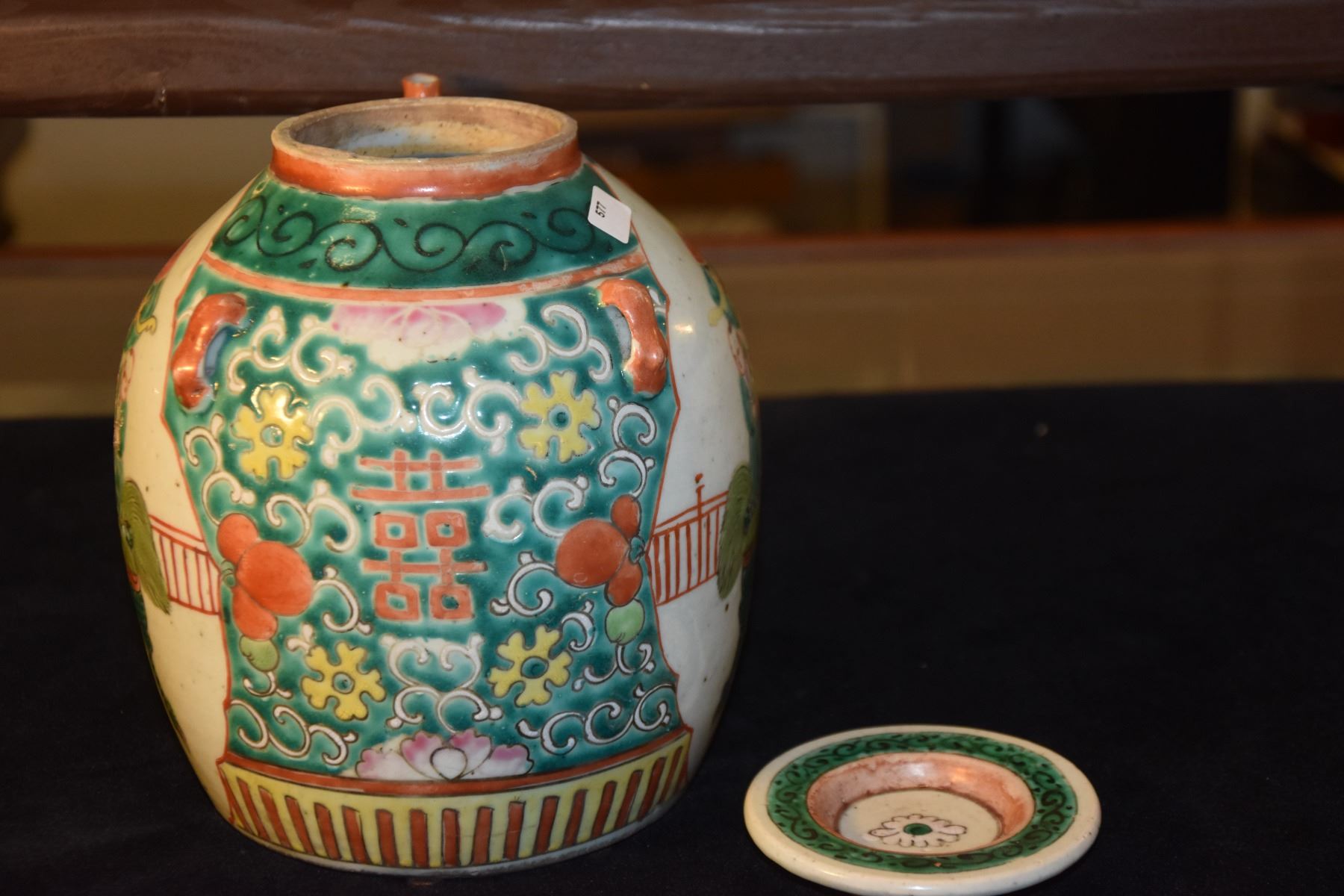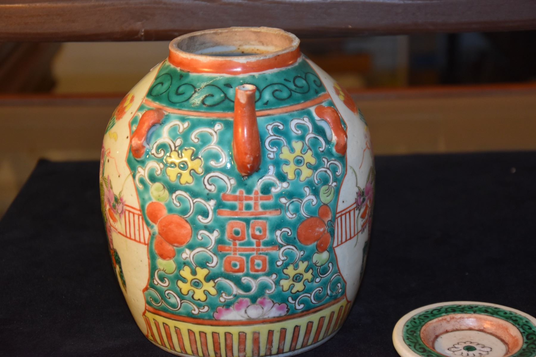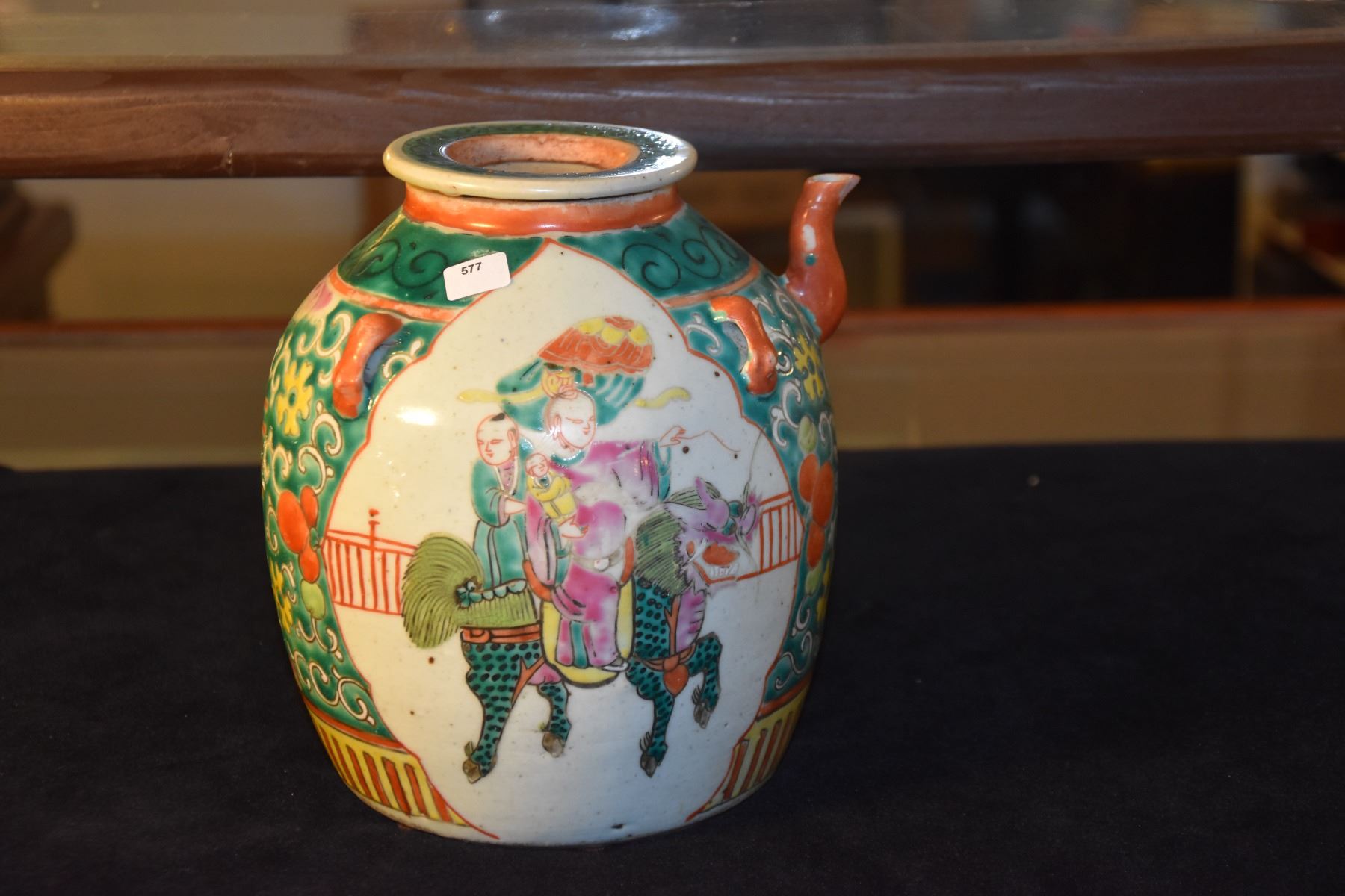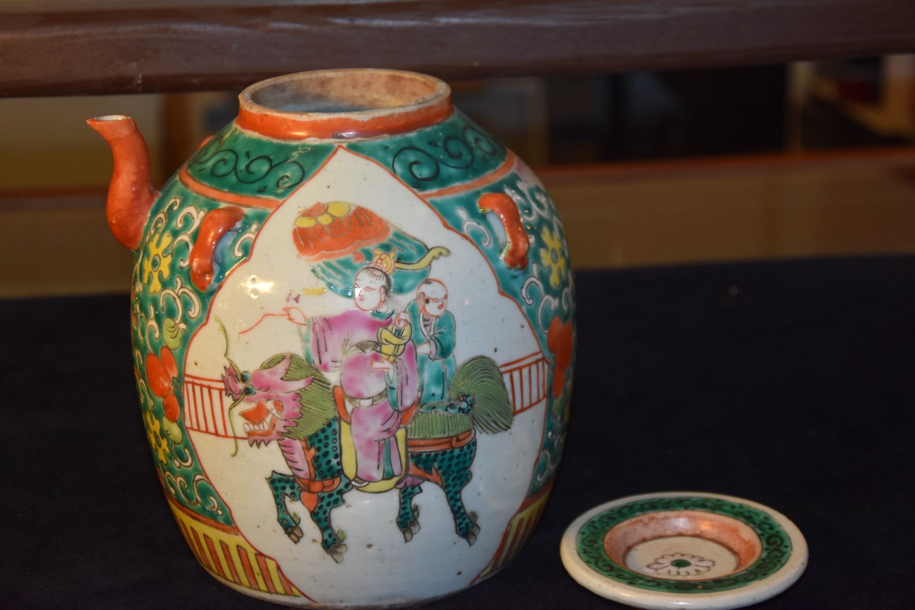 CHINESE POLYCHROME COVERED WINE JUG, CHILIN MOTIF (8 ) (DOES NOT INCLUDE STAND)