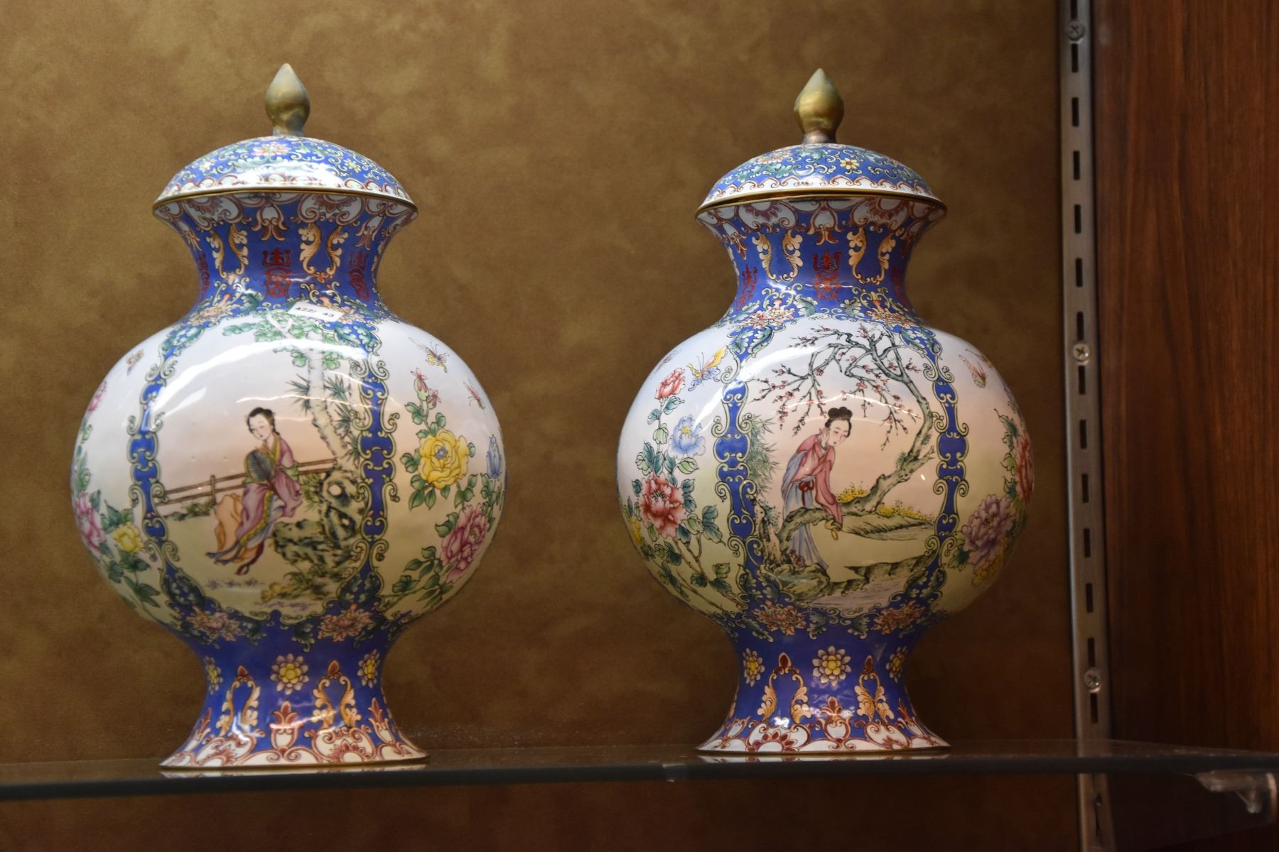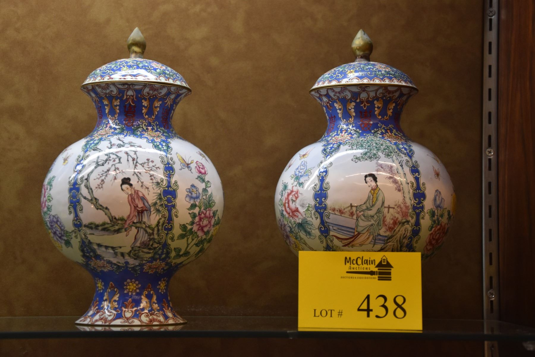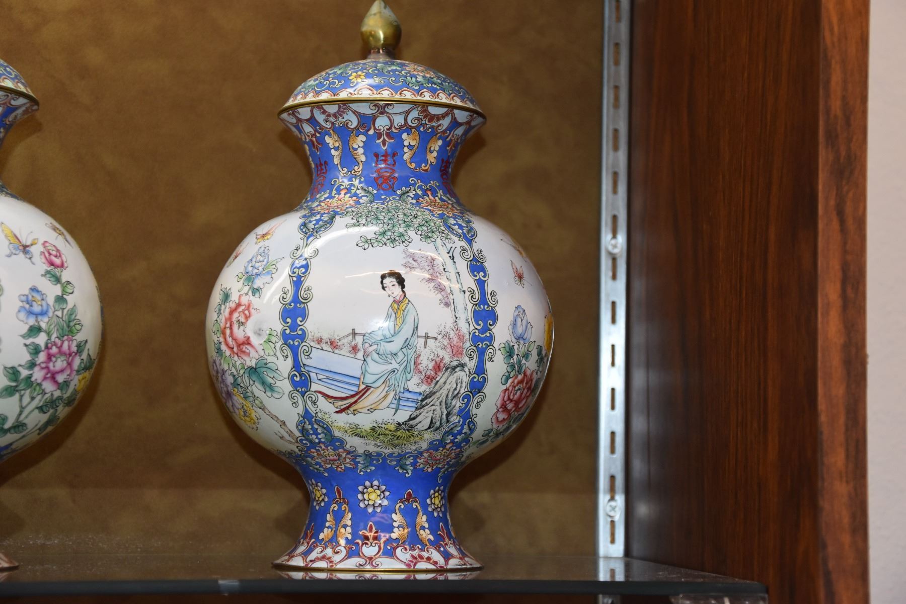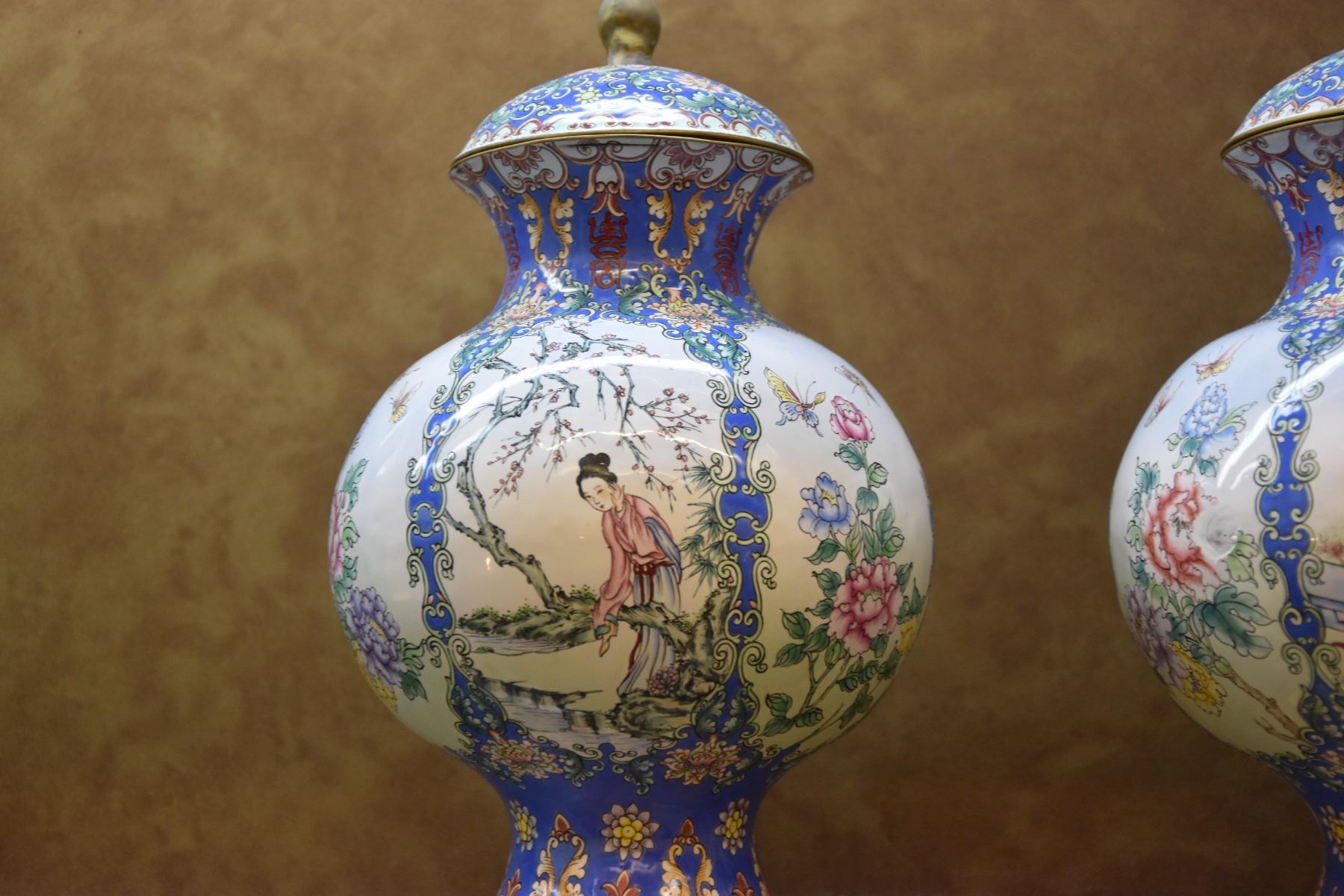CHINESE POLYCHROME ENAMEL VASES W/COVERS (PAIR)