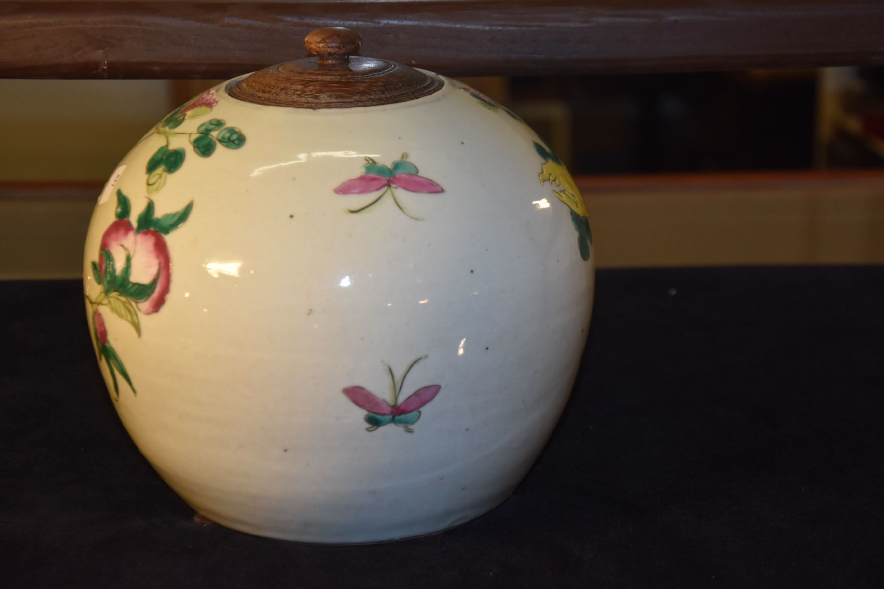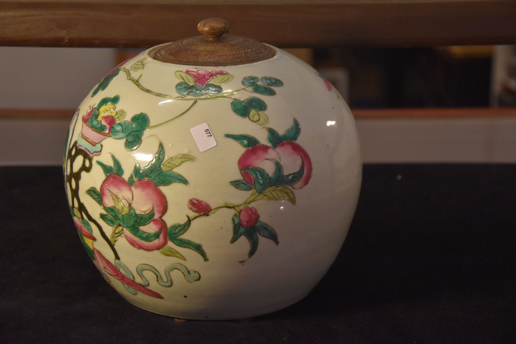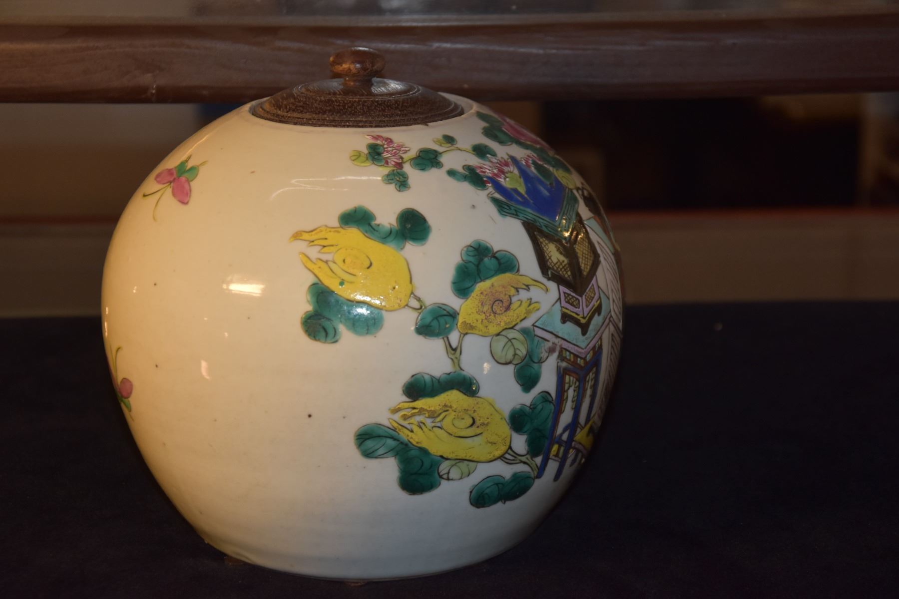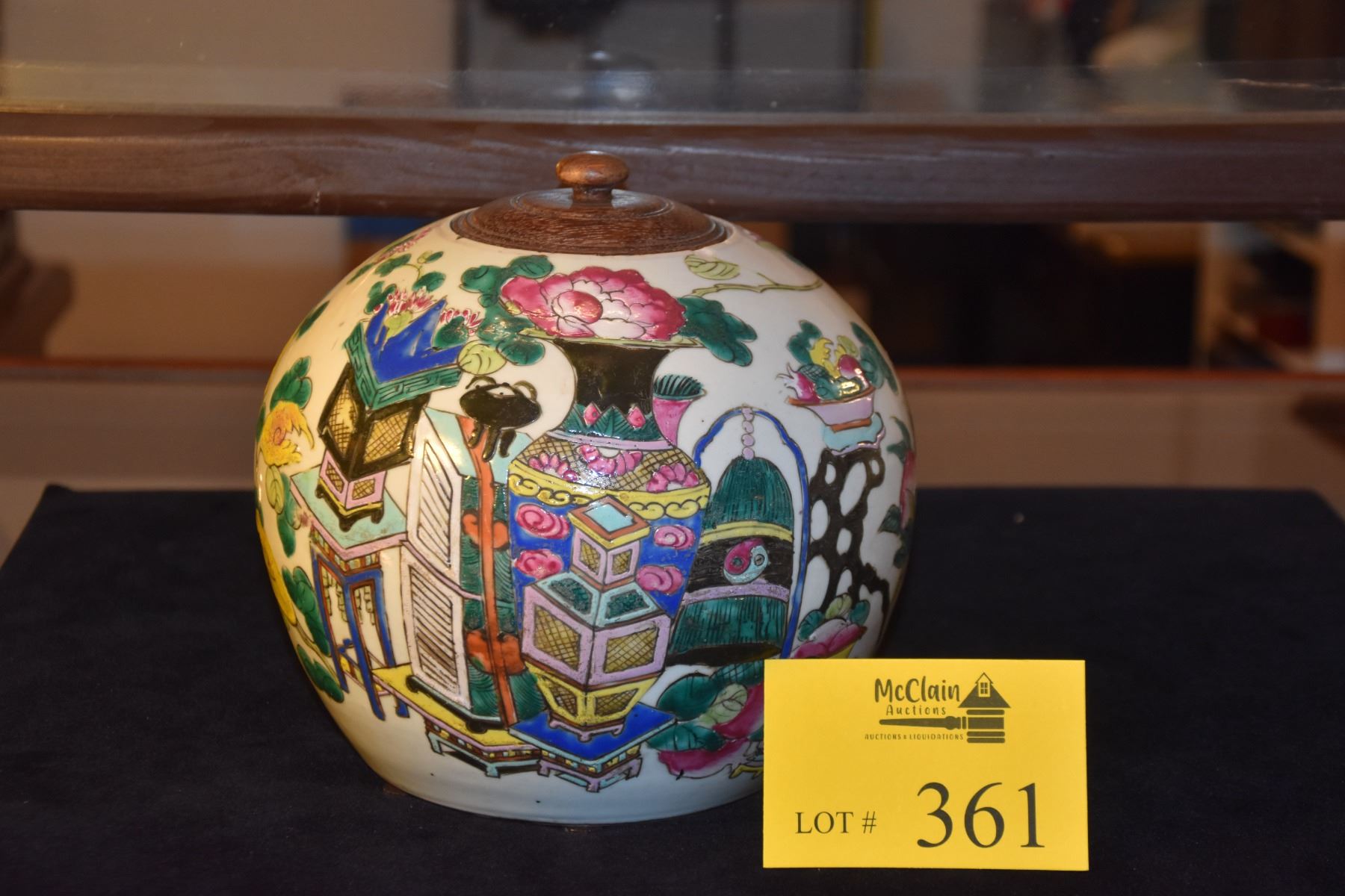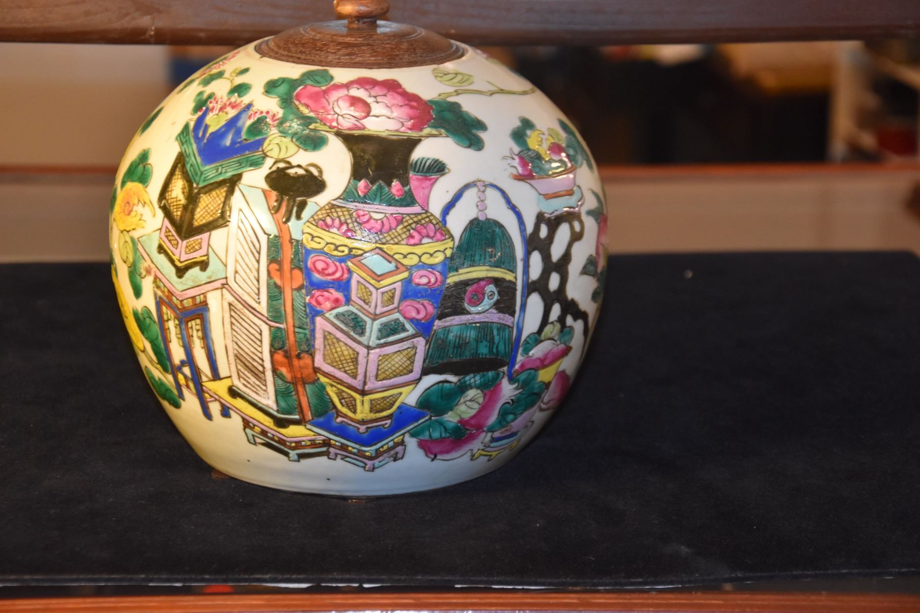 CHINESE POLYCHROME GINGER JAR W/WOOD LID, 100 ANTIQUE MOTIF (8 1/2 )
