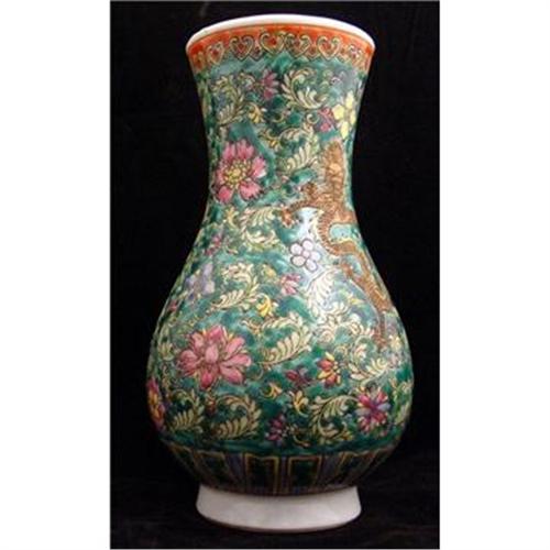 A FINE & RARE Large Eighteenth Century Chinese Famille Porcelain Vase, hand-painted with traditional Chinese taste decoration depicting a pair of Celestial Dragons Flying in the flower heaven, Measuring 8.8" in height by 4.5" wide. The vase is marked with the Four-character reign mark of the Qianlong Emperor in the base.