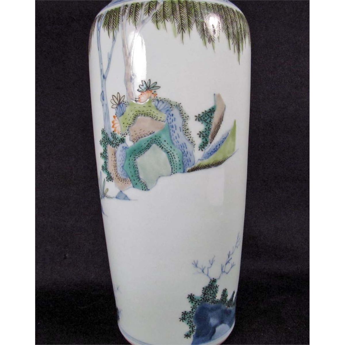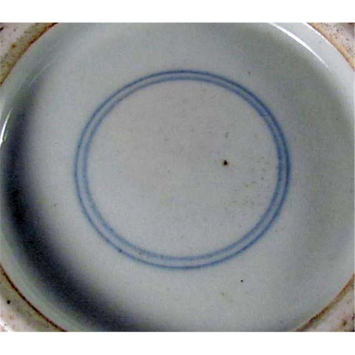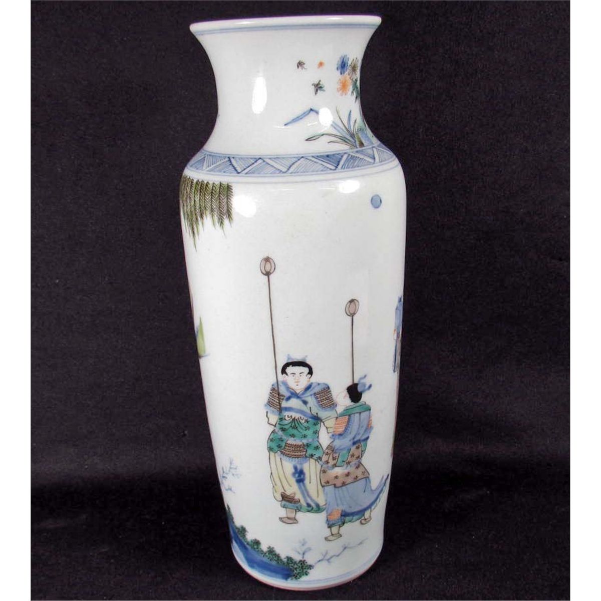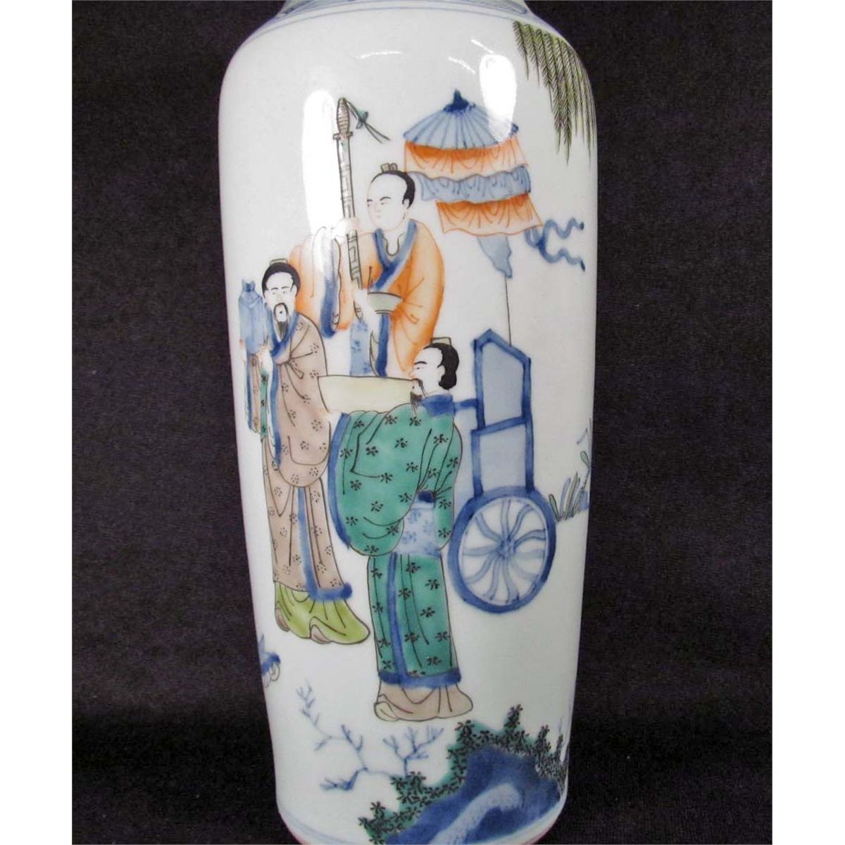 Approx. 11.5" tall. Double ring blue mark. Five men landscape scene.