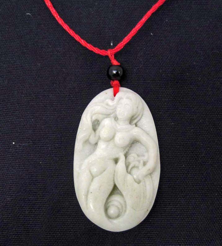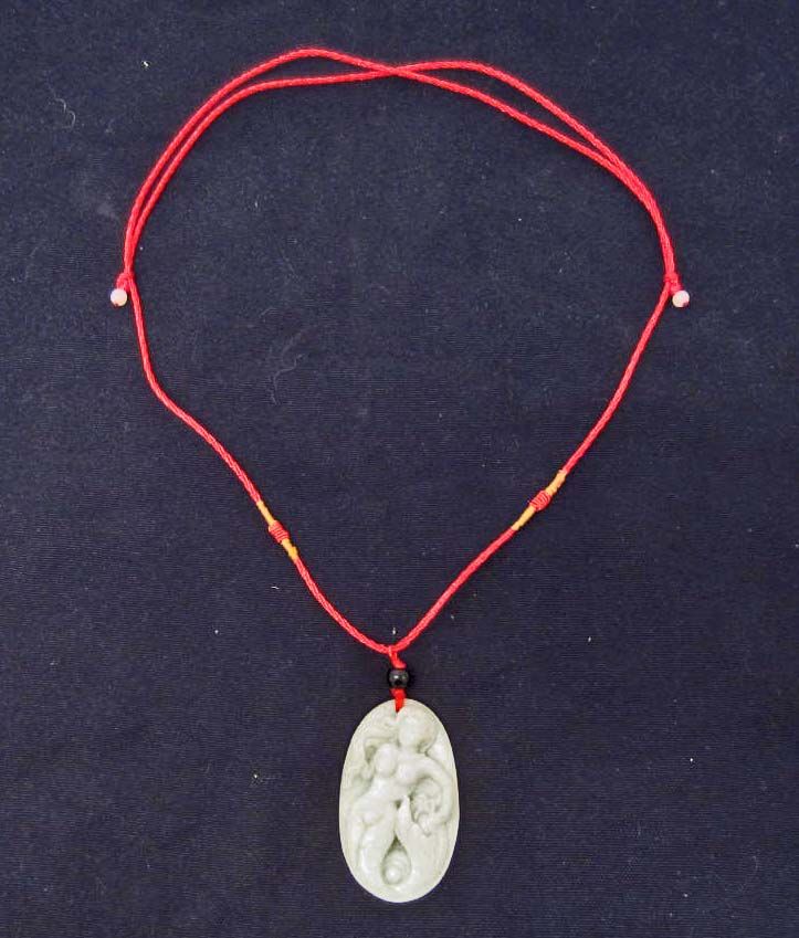 Measures approx 2" x 1-1/4. Includes thread necklace.