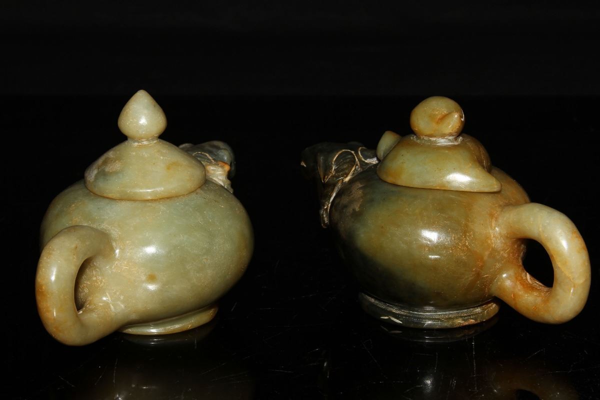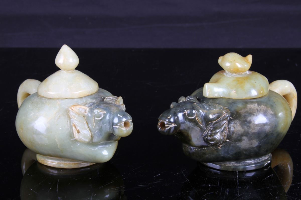 [CHINESE] QING DYNASTY A PAIR OF JADE CARVED BUFFALO HEAD TEA POT W:6" H:4"清 玉制牛头壶摆件一对(以最大物品计量)