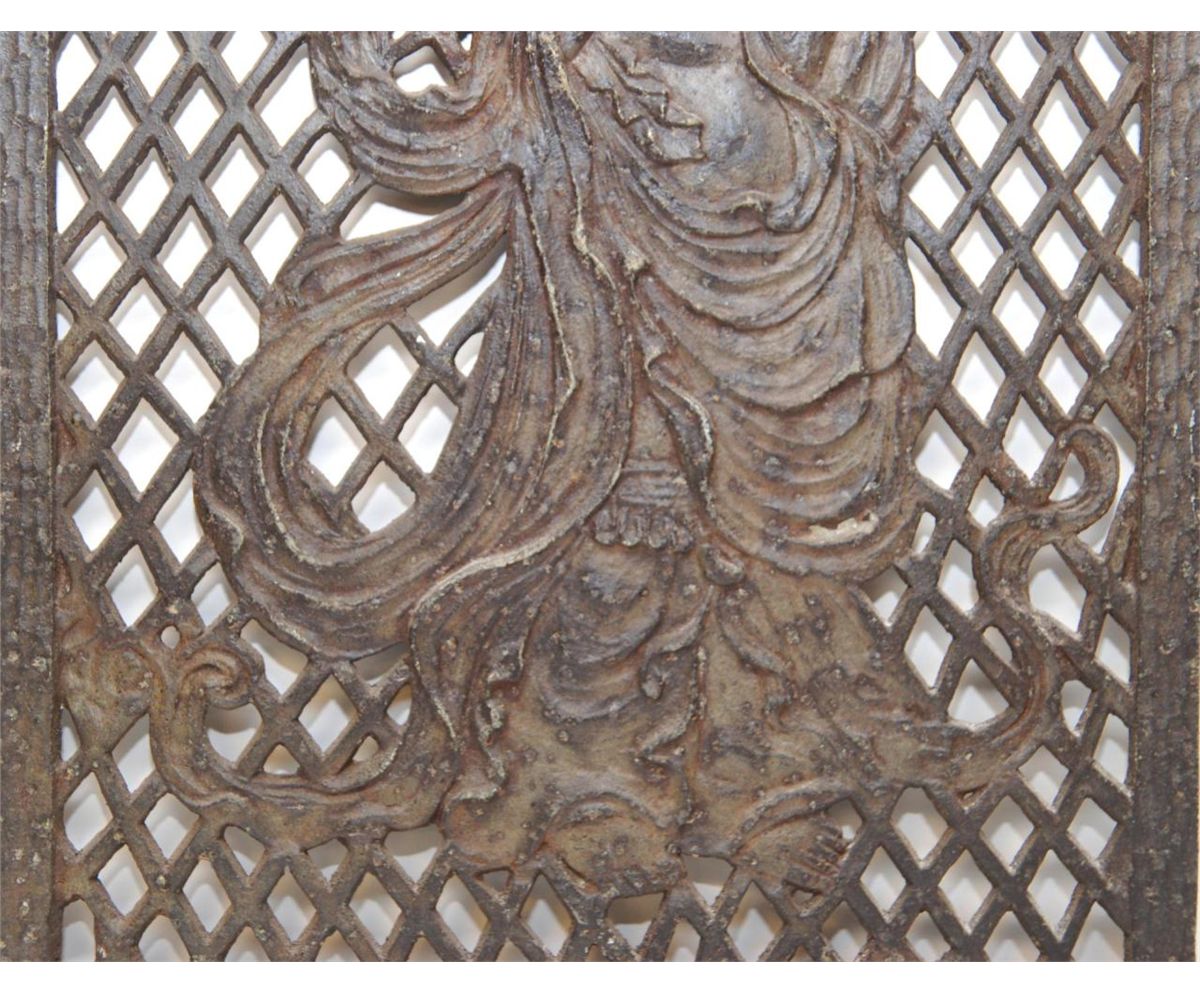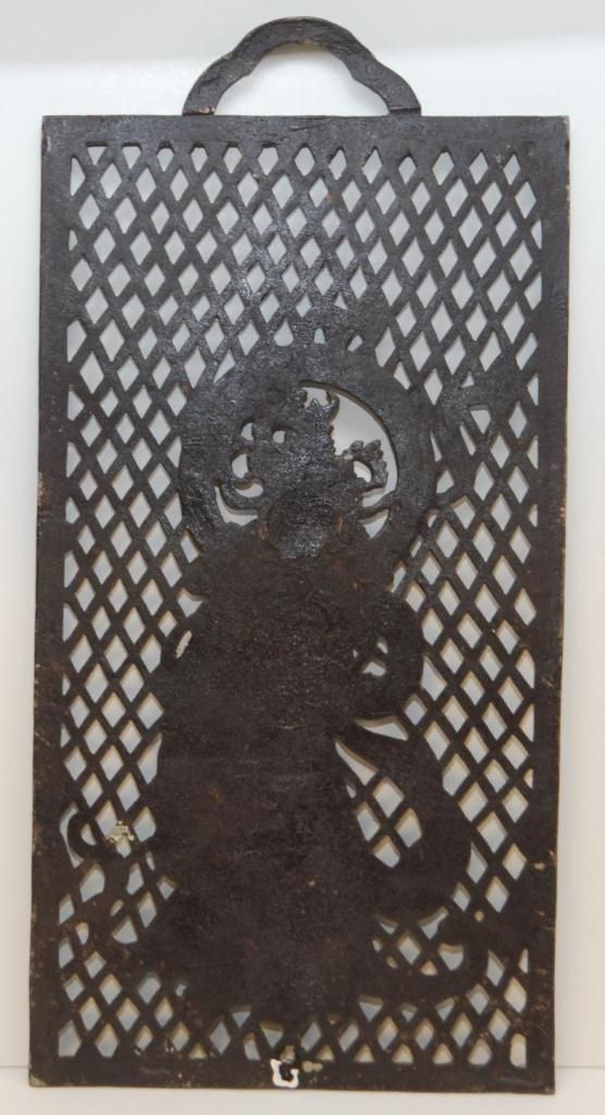 Antique Chinese cast iron temple hanging depicting a meiren playing the flute over a reticulated diamond matrix background. 17th/18th century. Measures 23 1/2" height x 11 1/2" width (59.6cm x 29.2cm). Total weight of 1.26 kilograms.