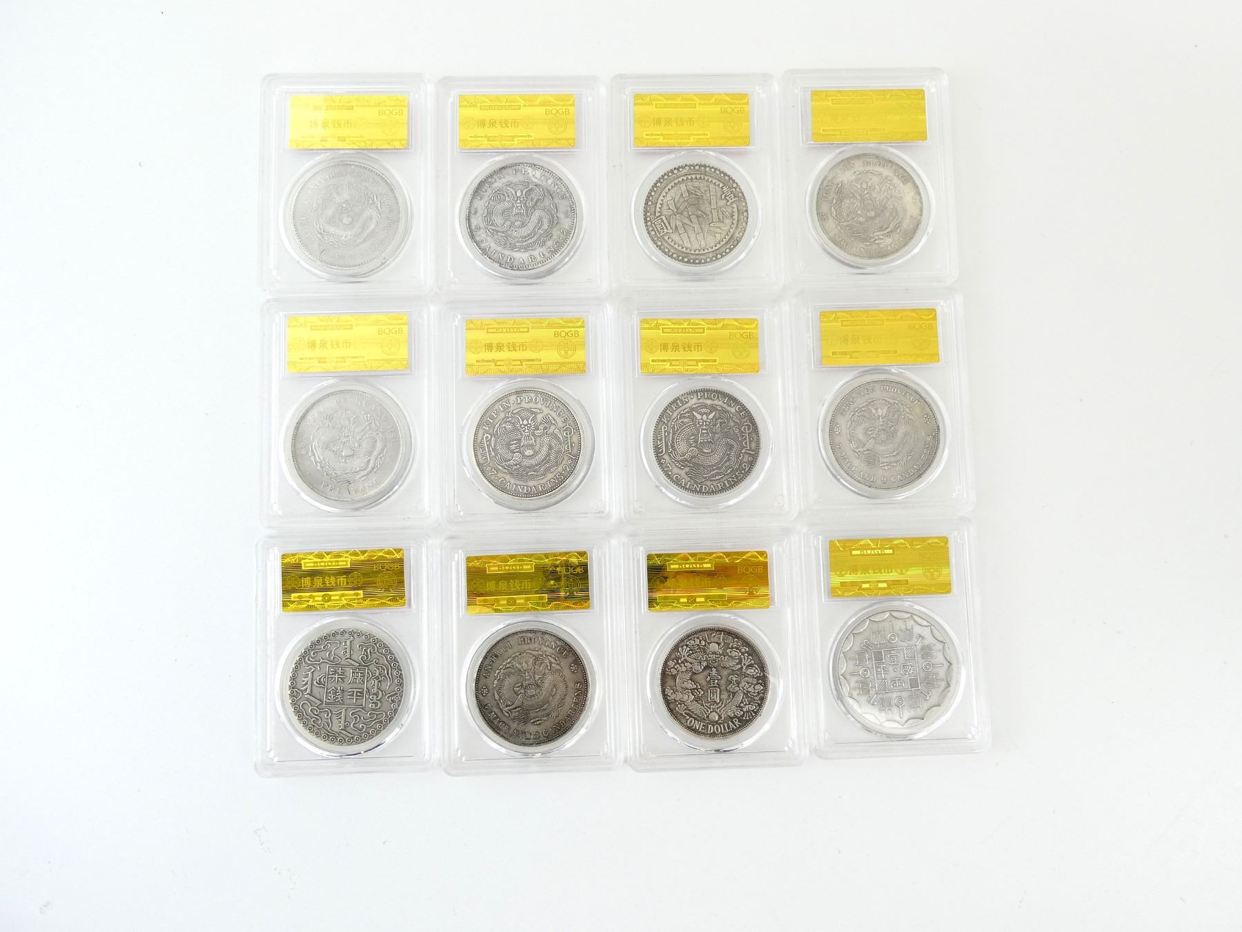 APPROX. (48) COINS IN PLASTIC COVERS, CONSIGNOR STATES: "A COMPLETE CASE OF 40 CHINESE CHING COURT ISSUED COINS, CIRCA EARLY 20TH CENTURY", COINS DATING FROM 1875 TO 1949, SOME DATES MISSING / SOME DUPLICATE DATES, INFORMATION / HISTORY SHEET INSIDE CASE, SAMPLE TEMPLATE CHART WITH EACH COIN LISTED, VELVET CASE APPROX. 13.5" X 9.5" X 3.75". SEE PHOTOS.