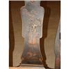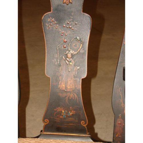 PAIR OF CHINESE QUEEN ANNE STYLE CHAIRS. Consists of one armchair and one sidechair. Decorated with gilt Oriental scenes. Marked with Oriental mark on backs. Armchair: 41” H to top of back, 26” W. Side chair: 39.75” H to top of back, 20” W