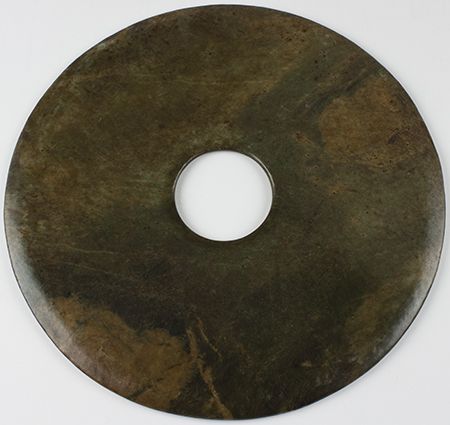 A fine artifact from an ancient Asiatic trading ship, a ritual disk in beautiful mottled green jade, measures 14" dia. with a 3 1/4" hole at center. Dates from c. 1600-1050 B.C. Bi disks were used as ritual implements in sacrificial ceremonies and in the earliest dynasties (Liangzhu to Xia), originally used as a ritual vessel to offer sacrifices to the god(s) of the heavens. This beautiful example was recovered by noted artifact collector Robert Marx in a junk off of the Sumatra Island, Indonesia. With a COA from Marx. Fine condition, excellent for display.