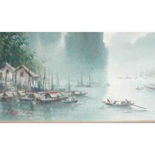A stunning Chinese original watercolor on textured paper by John Chan. The subject is a quiet rural River Village typical of old China. This is the companion piece (470802) to "Hong Kong Harbor" offered here being sold separately. Framed in Hong Kong