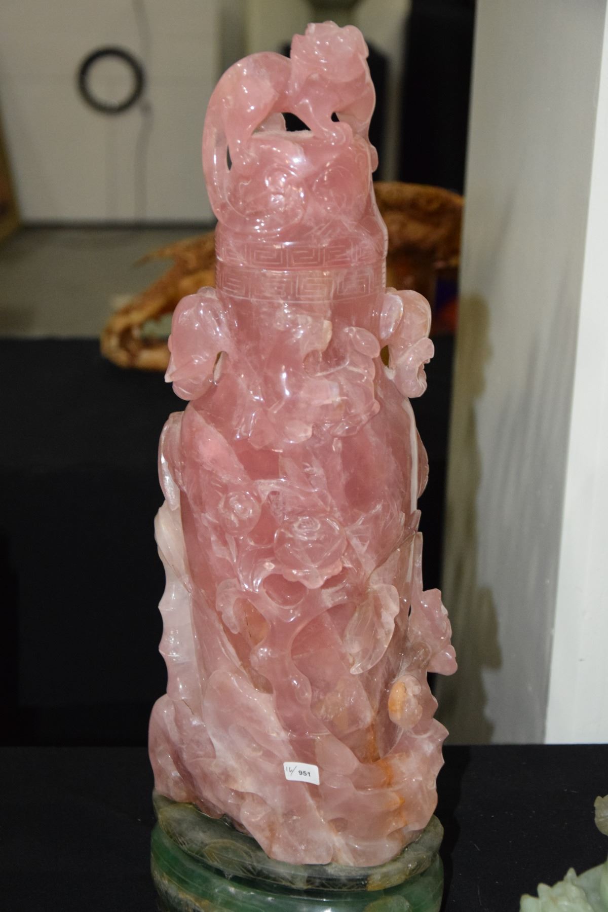 CHINESE ROSE QUARTZ EXTRAVAGANTLY CARVED LIDDED VASE ON GREEN STONE BASE