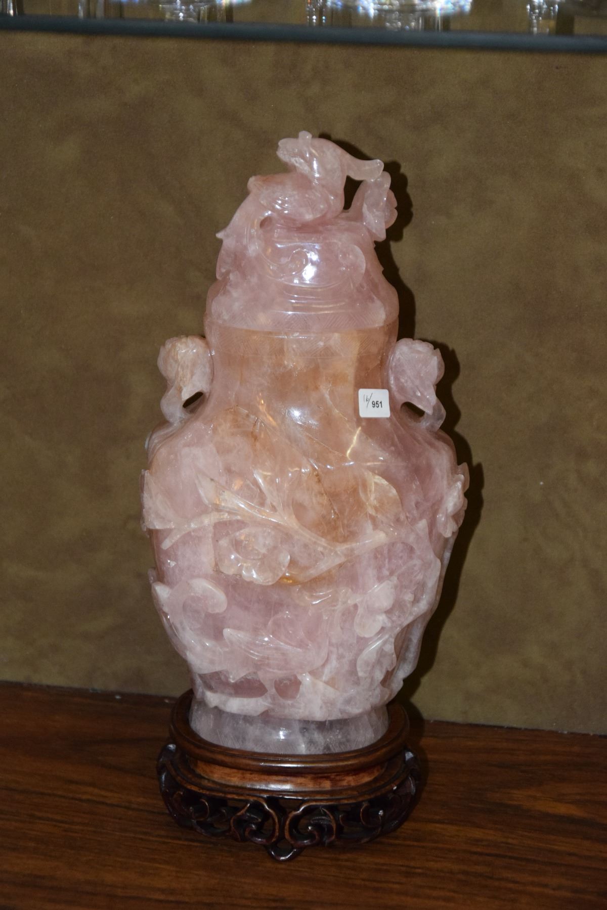 CHINESE ROSE QUARTZ LIDDED VASE ON STAND (13 1/2")