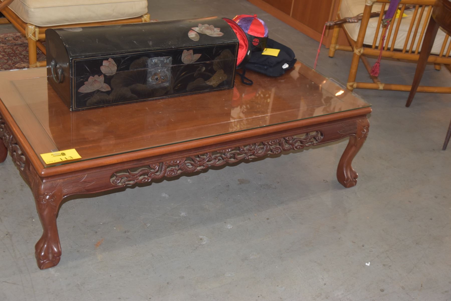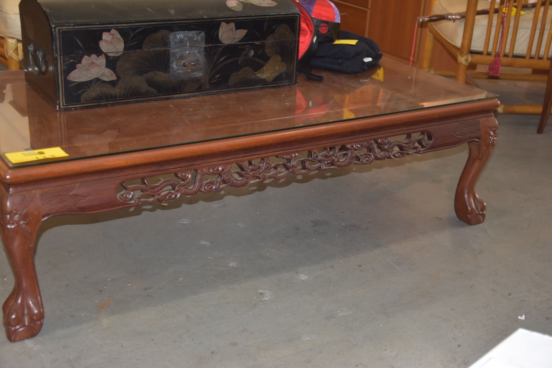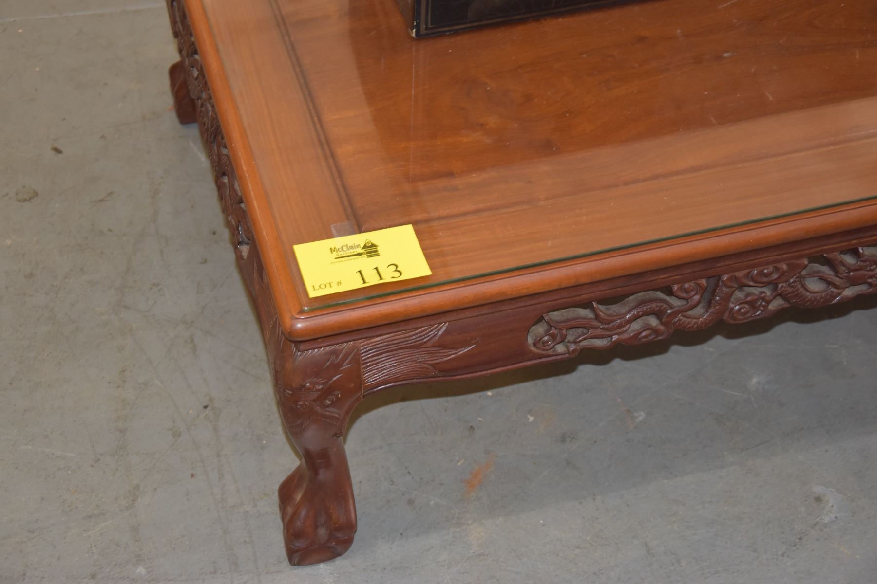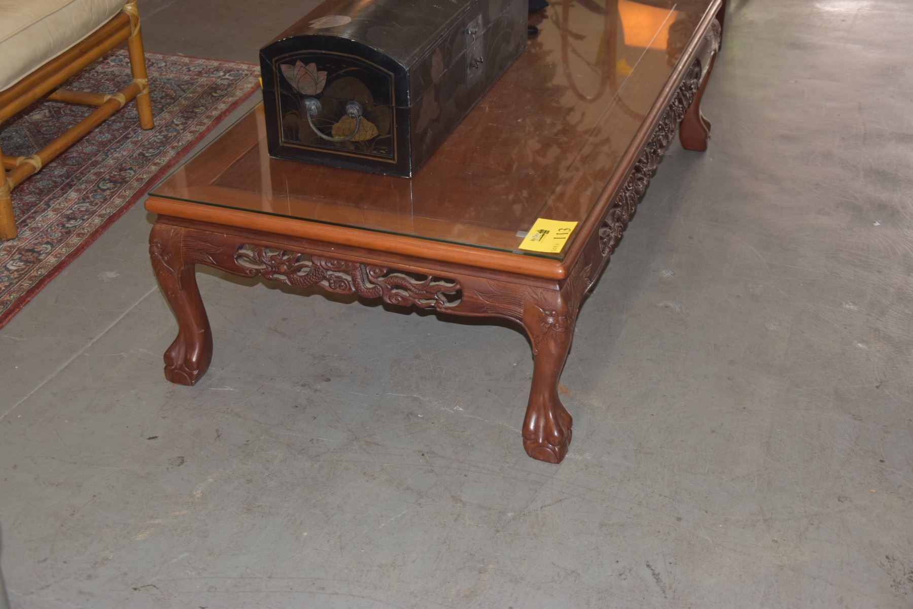 CHINESE ROSEWOOD COFFEE TABLE W/OPEN WORD DRAGON MOTIF W/GLASS TOP (53 1/2" X 29")