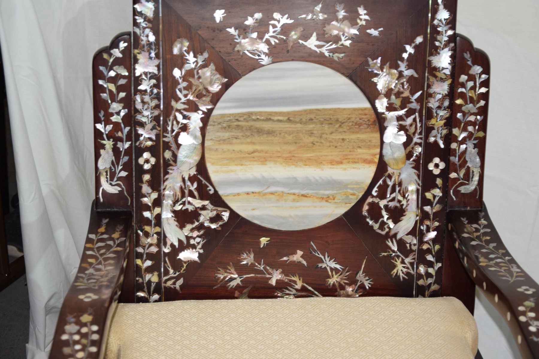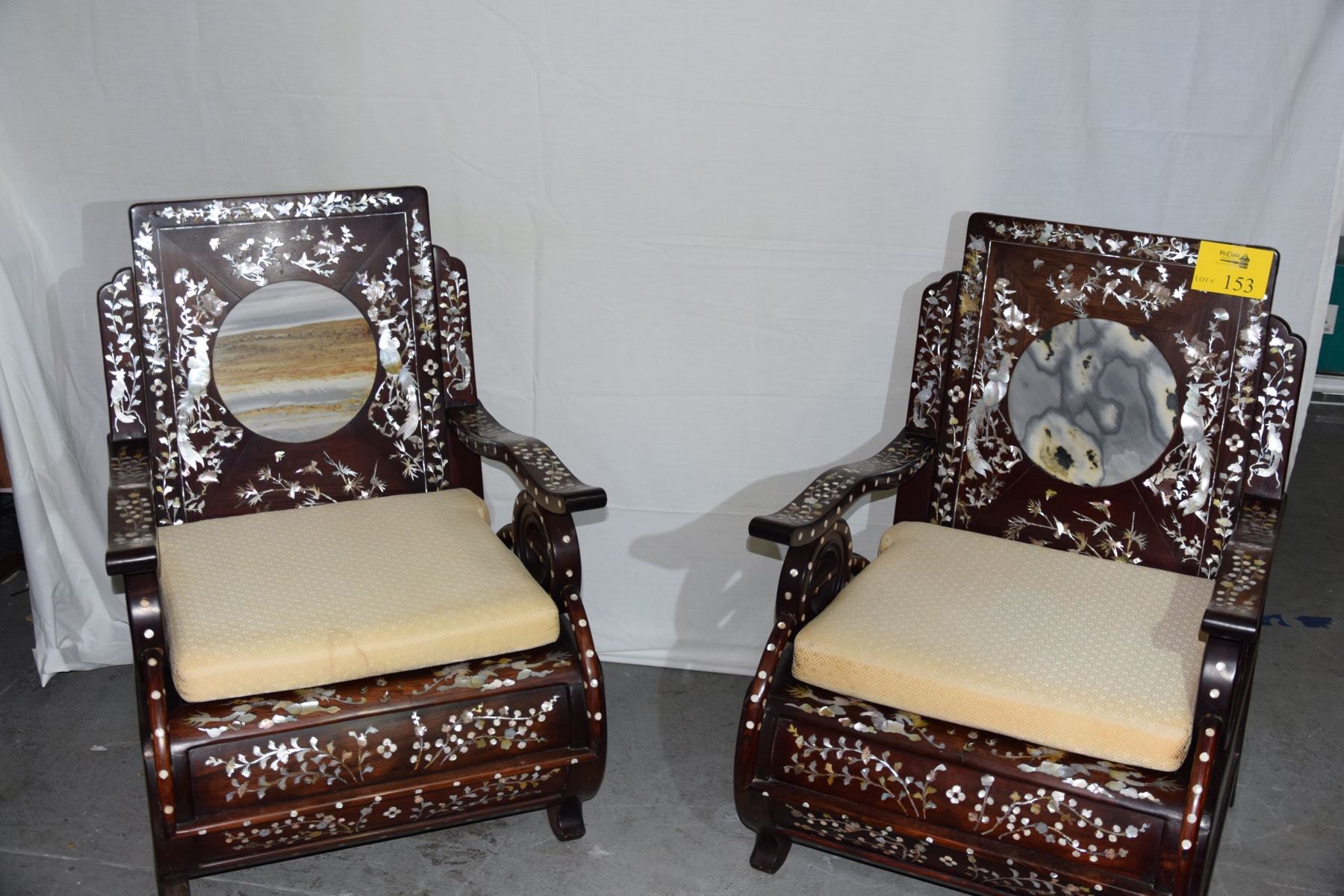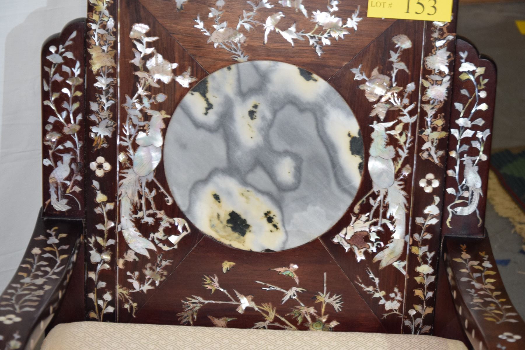 CHINESE ROSEWOOD INLAID MOTHER OF PEARL ARMCHAIRS, THE BACKS W/ROUND STORY MARBLE INSETS, MOTHER OF