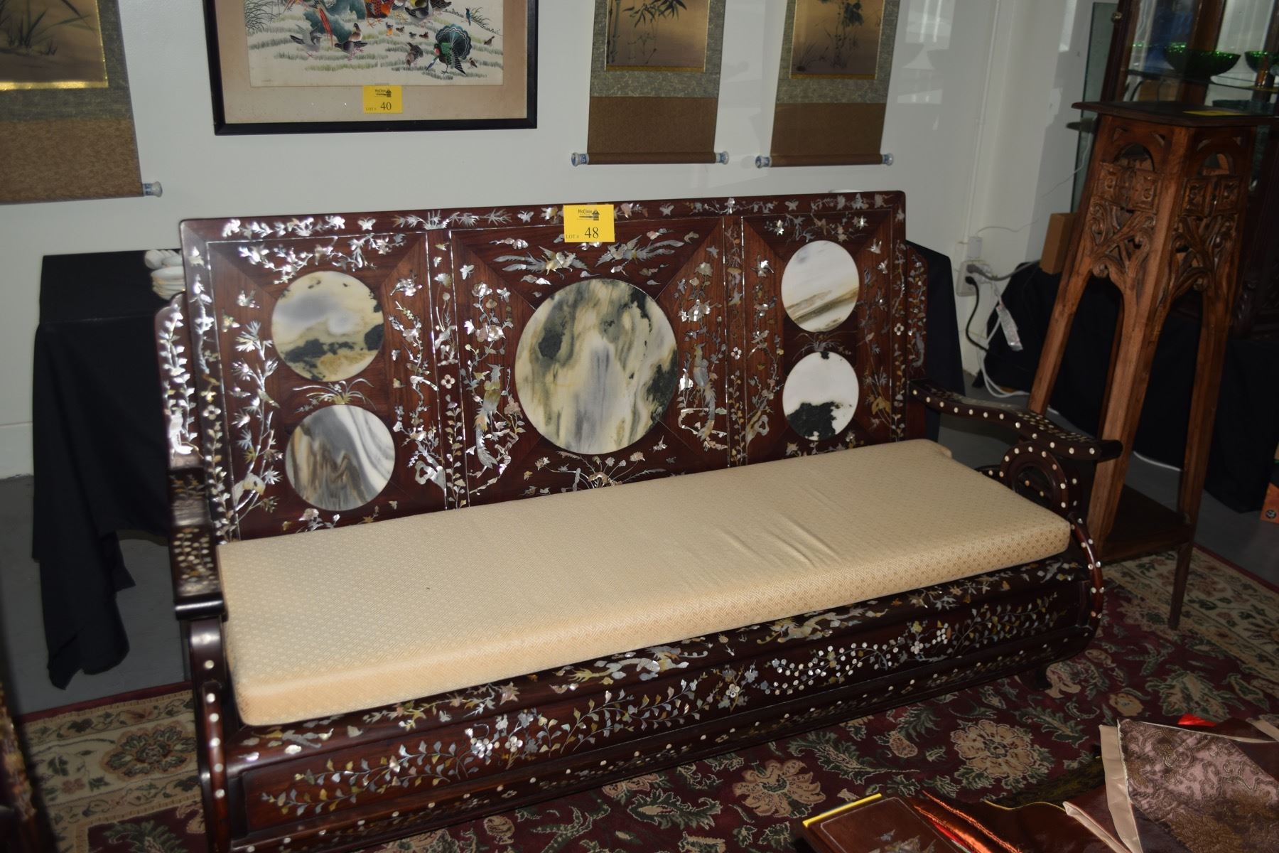 CHINESE ROSEWOOD SETTEE W/ARMS & MOTHER OF PEARL INLAY OF FLOWERS, BIRDS & DRAGONS. THE BACK W/5 ROUND STORY MARBLE INSETS (63 1/3" X 23 1/4" X 36 1/2")