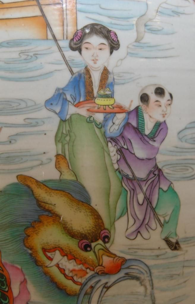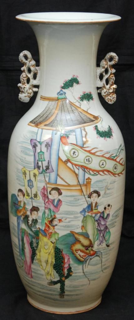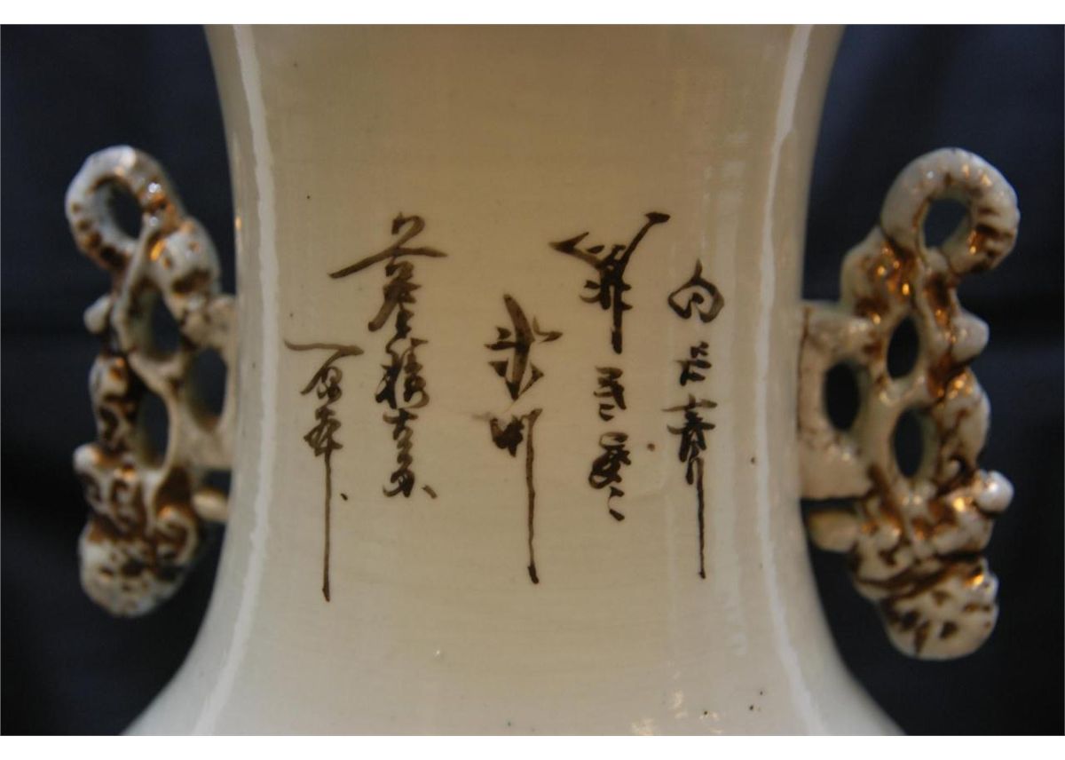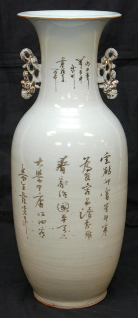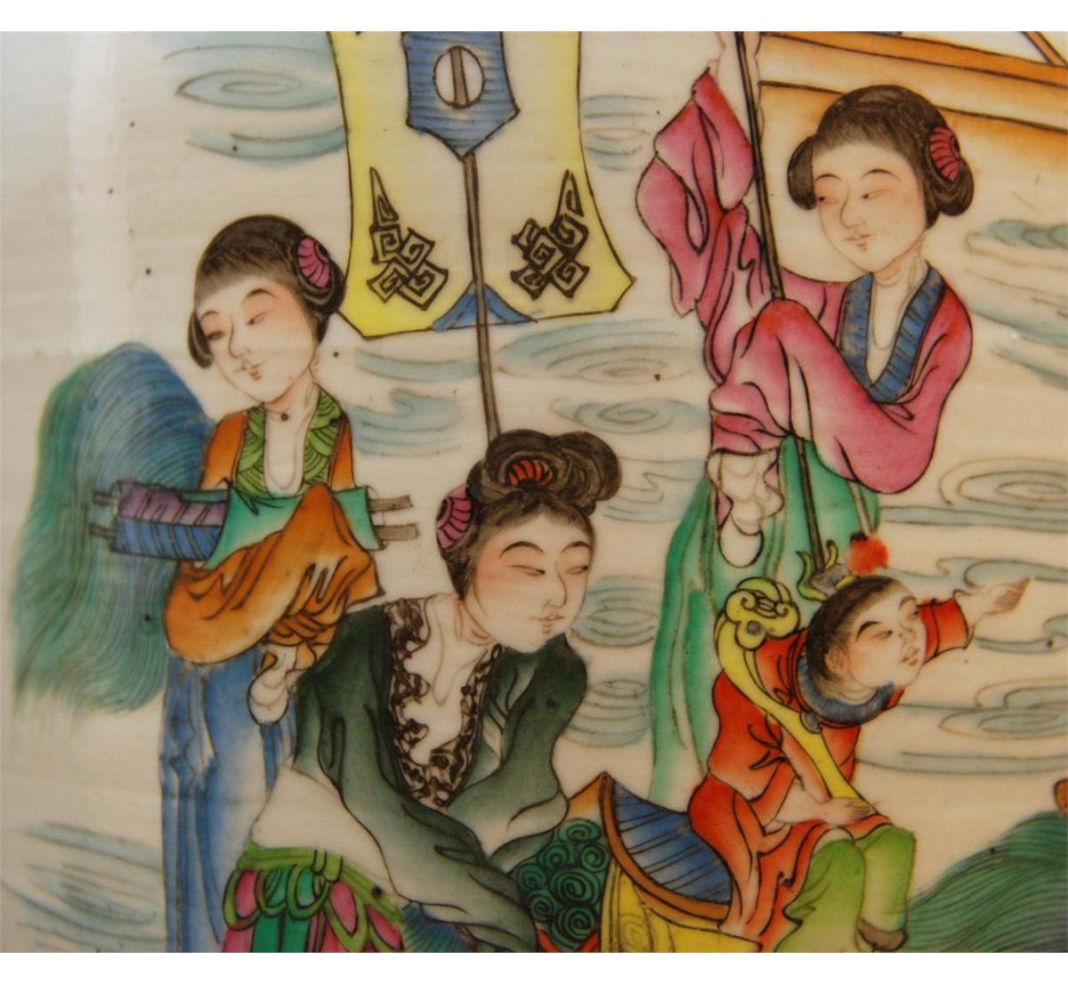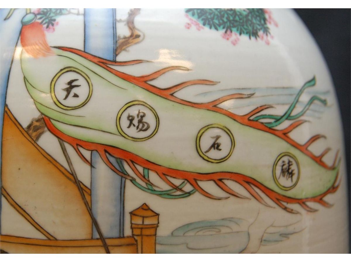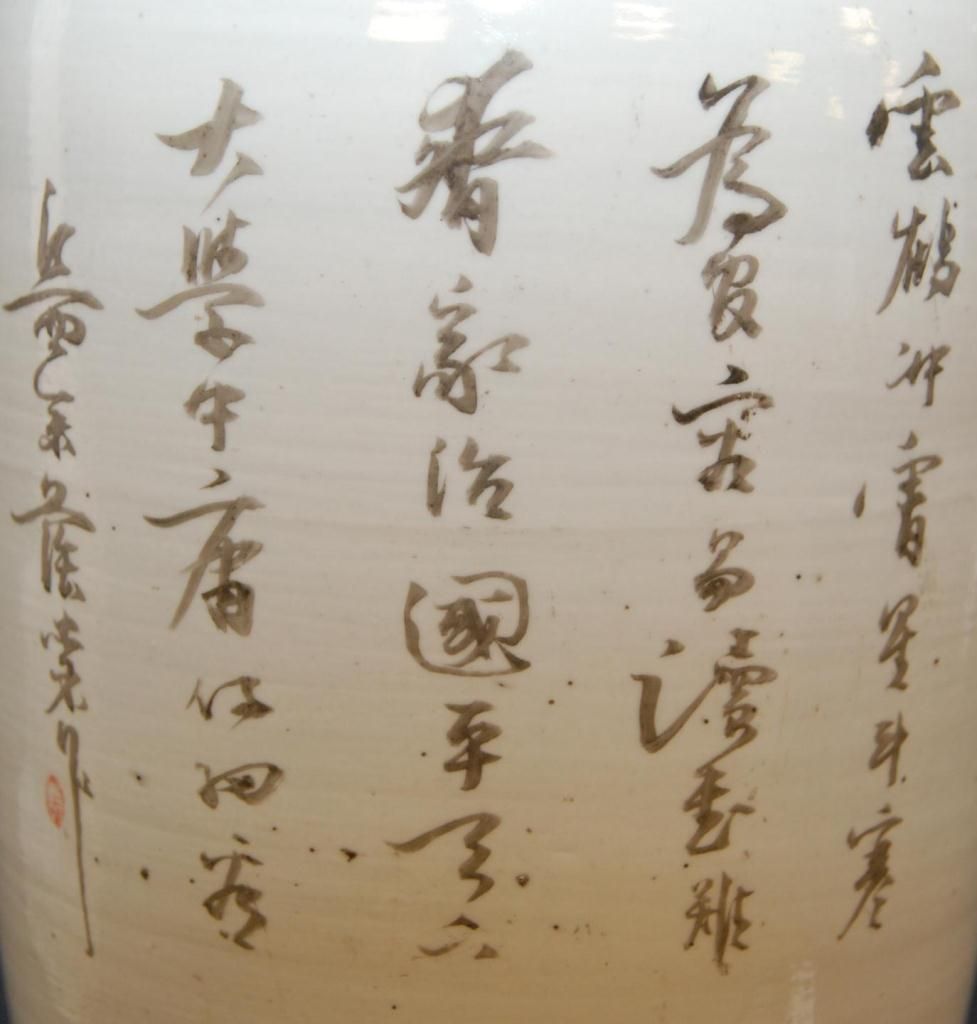 A Chinese scenic porcelain calligraphy vase depicting maidens with kylin beast and attendants. Has calligraphy poem to verso. with seal. Qing dynasty period. Measures 22 7/8" height x 9 1/2" width (58.1cm x 24.1cm). Total weight of 5.46 kilograms.