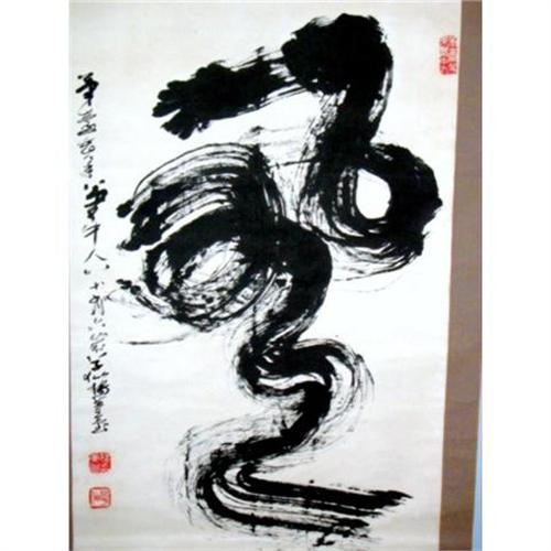 THIS SCROLL STYLE HAS BECOME VERY POPULAR LATELY WITH THE DESIGNERS. IT IS DONE WITH A SINGLE STROKE OF THE BRUSH BY THE ARTIST. USUALLY THE SYMBOL IS A HAPPINESS LONG LIFE OR SOMETHING SIMULAR.THIS IS PAINTED ON RICE PAPER AND THEN ATTACHED THE THE SCROLL PAPER. IT IS IN GREAT CONDITON EXCEPT FOR A SMALL TEAR IN THE TOP NEXT TO THE ROD AND ALSO ON THE BOTTOM NEAR THE SCROLL BAR. BUT IT IS NOT BAD.