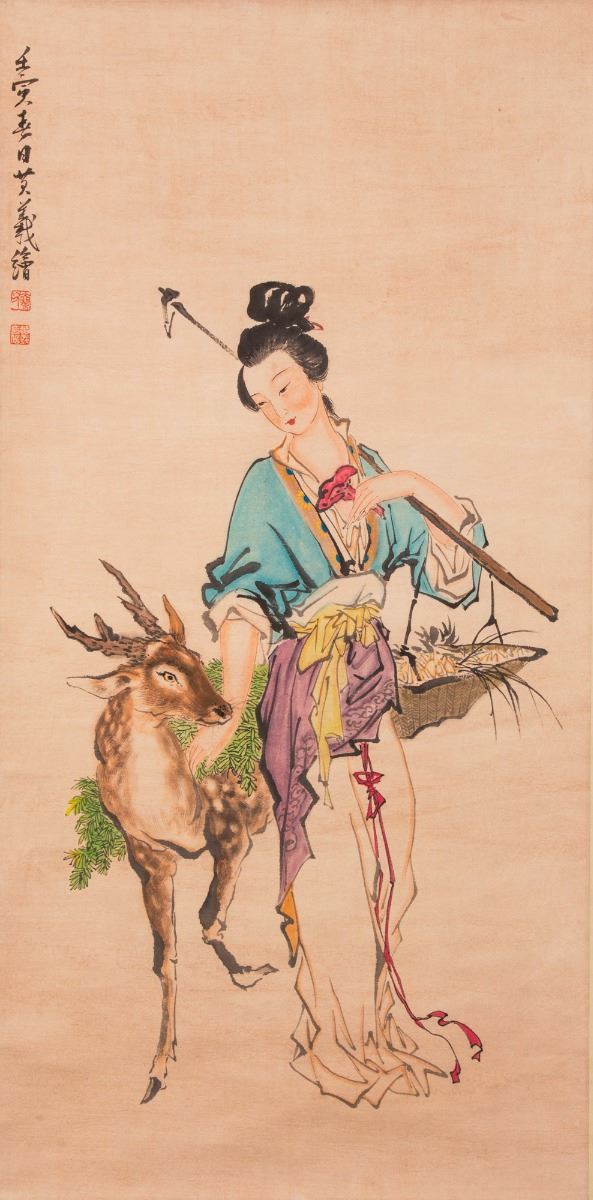 Chinese Scroll painting , ink and color on paper, depicting a lady playing with a deer . A flower is held in her left hand. Signed and with seals. Attribute to Huang Yi. Length38.5" Width 19.25"