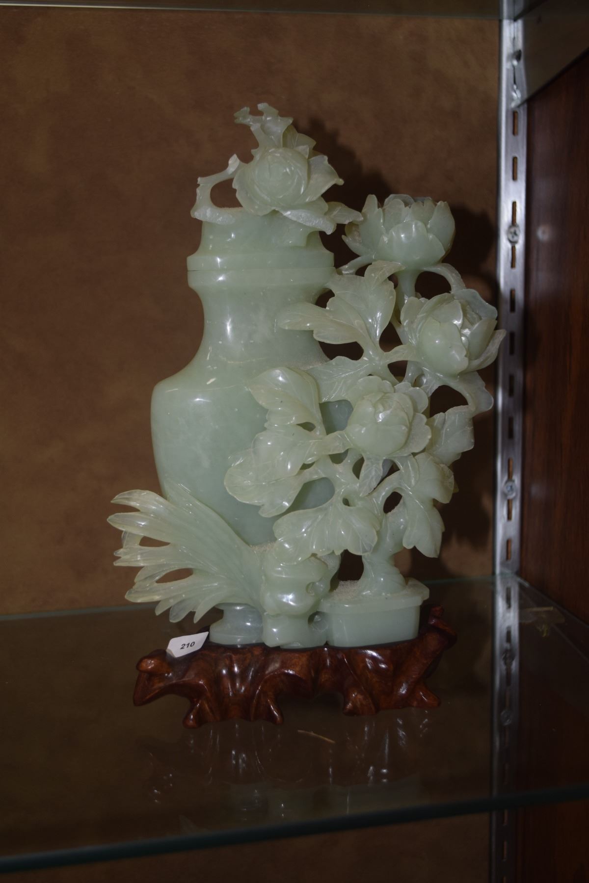 CHINESE SERPENTINE JADE CARVED PEONIES W/LIDDED VASE & STAND (10")