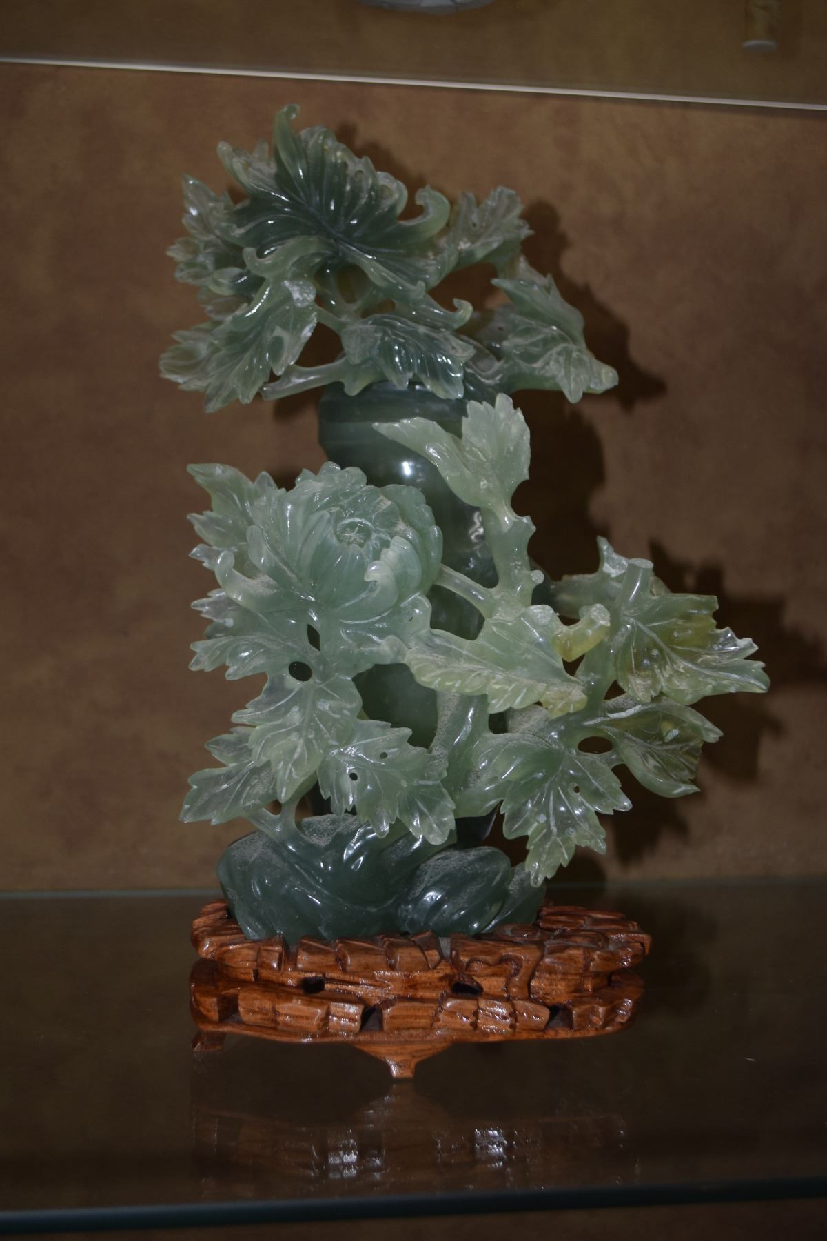 CHINESE SERPENTINE JADE CARVING OF PEONIES IN VASE W/LID & STAND (11") (MISSING SOME STEMS)