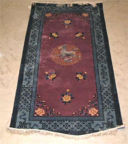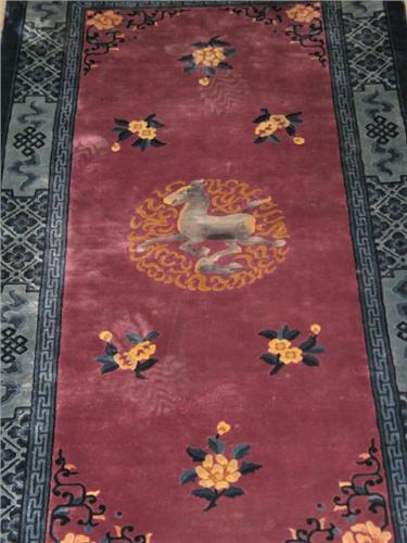 CHINESE SILK RUNNER. Good blue & lavender colors. Decorated with horse at center. 3’ x 6’