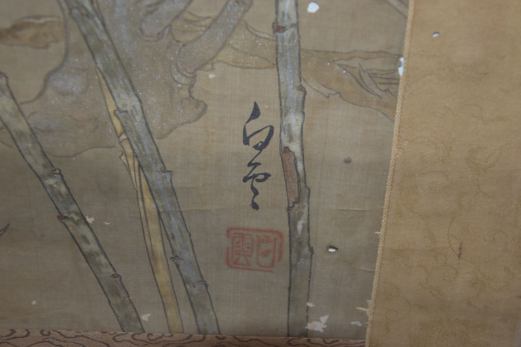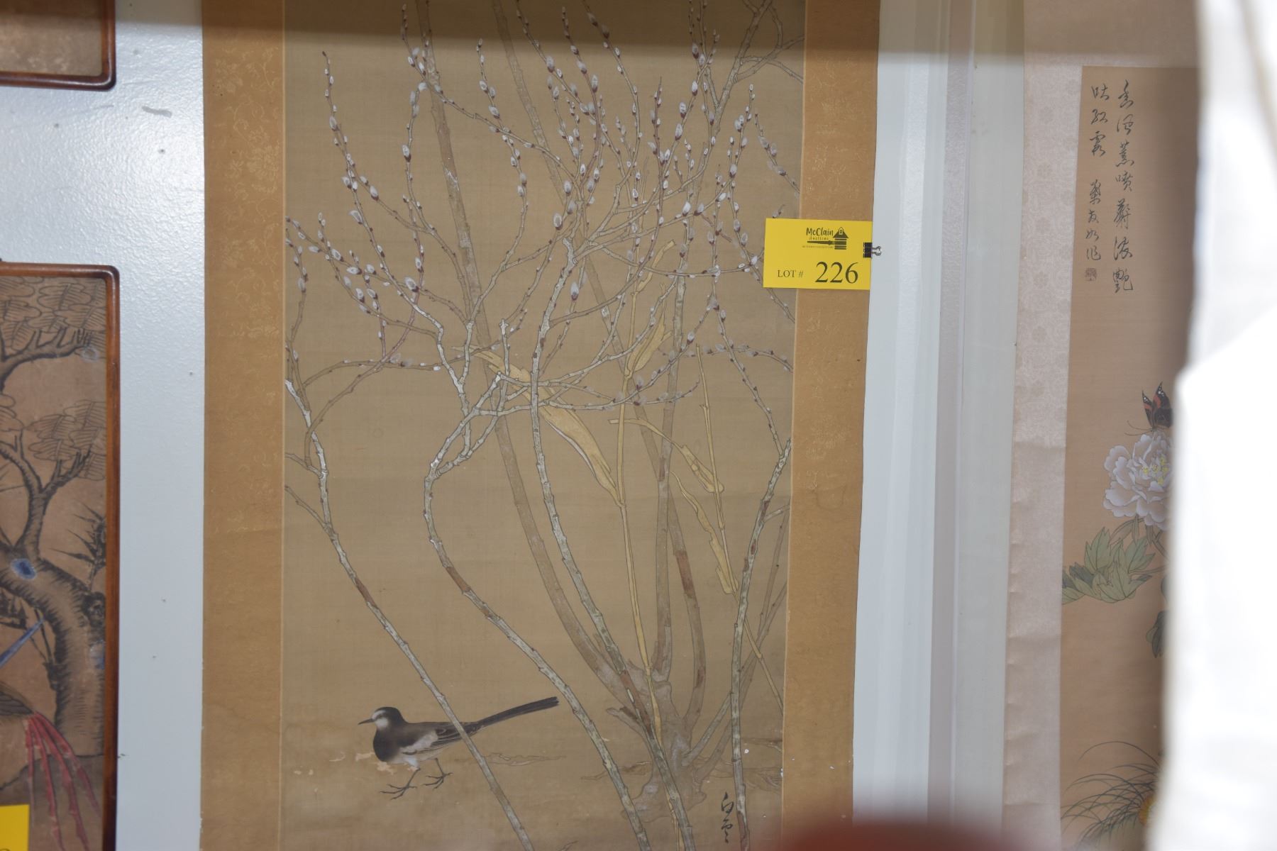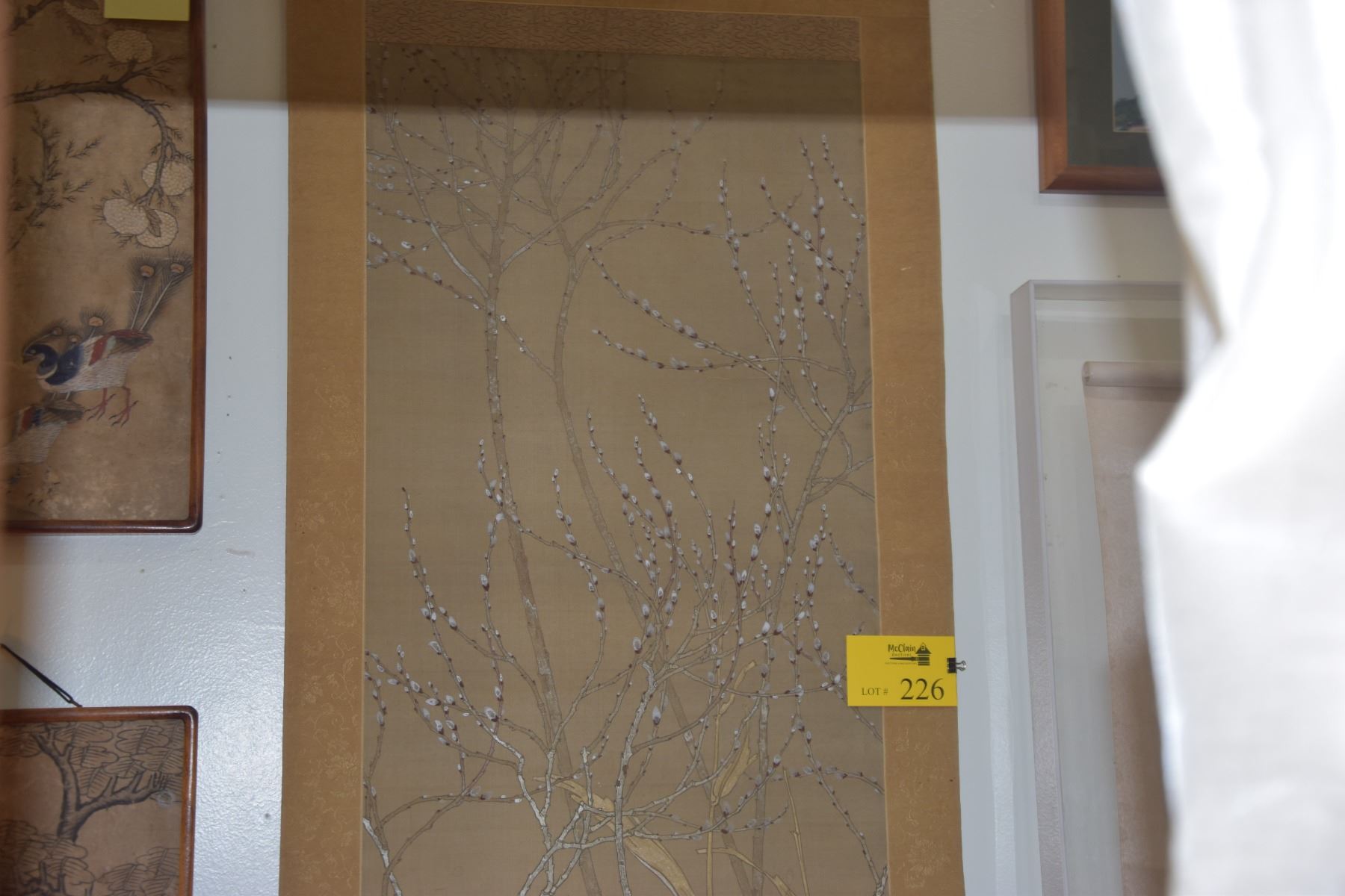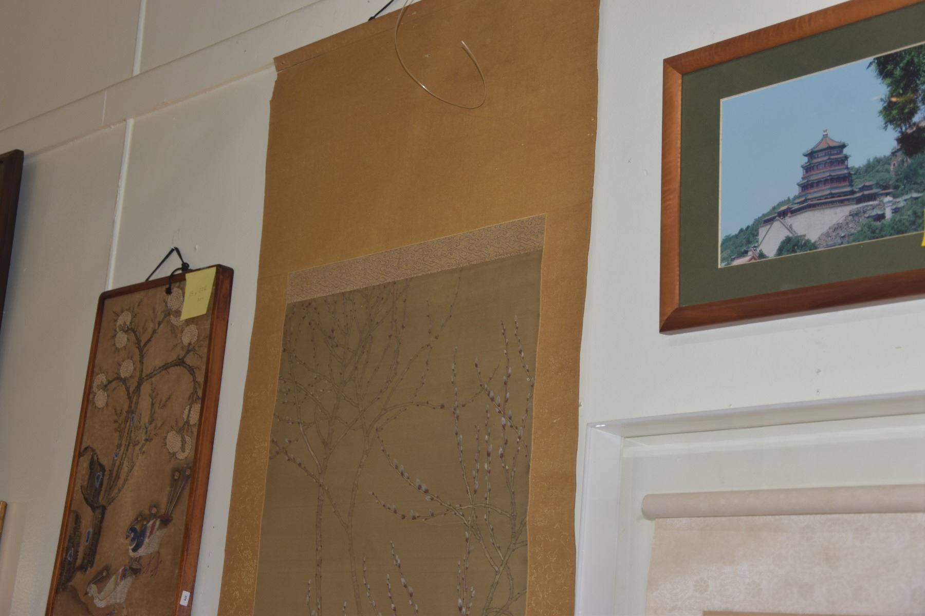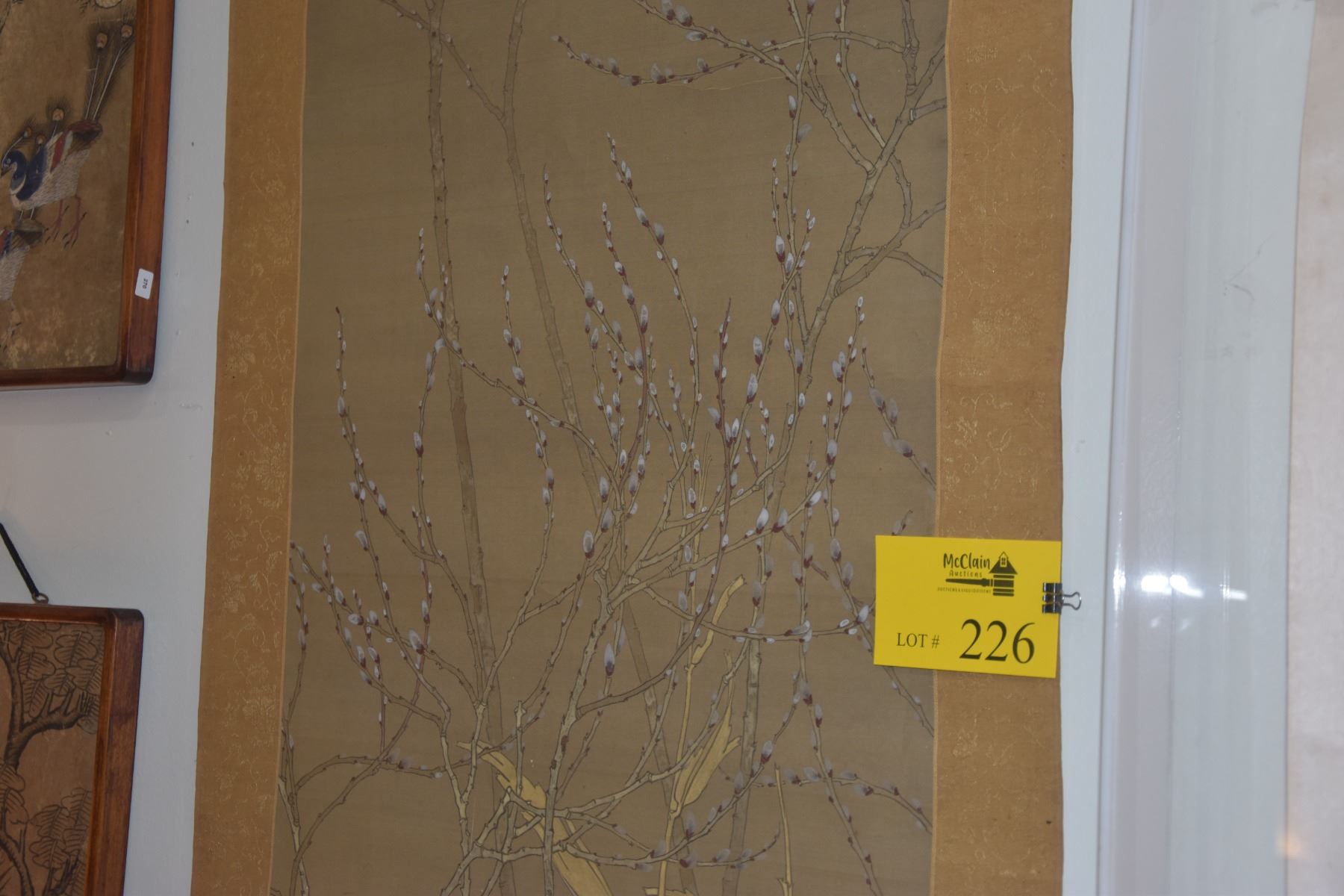 CHINESE SILK SCROLL, BIRD & BUDDING FLOWERS; SIGNED (APPROX. 74" X 25 1/2")
