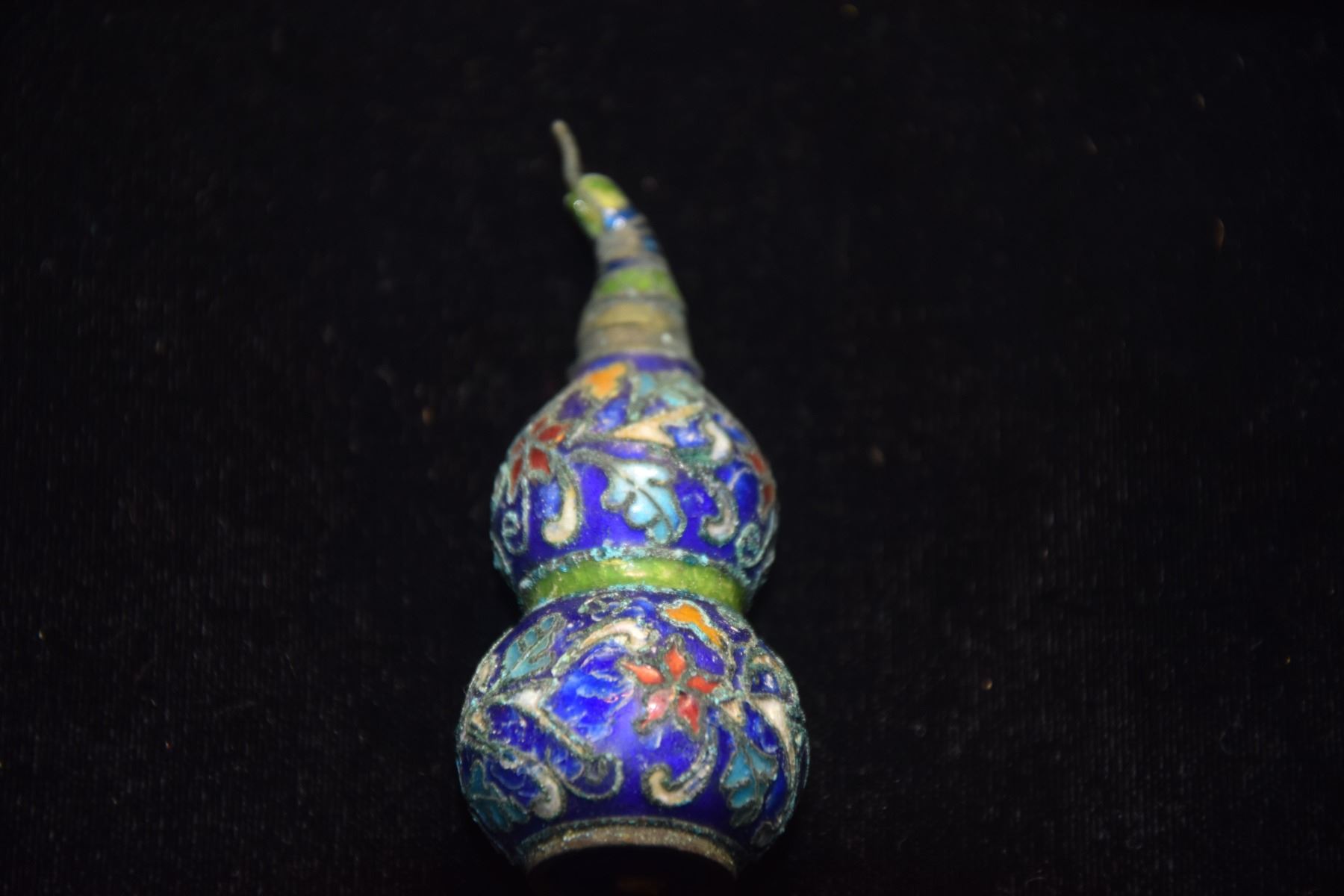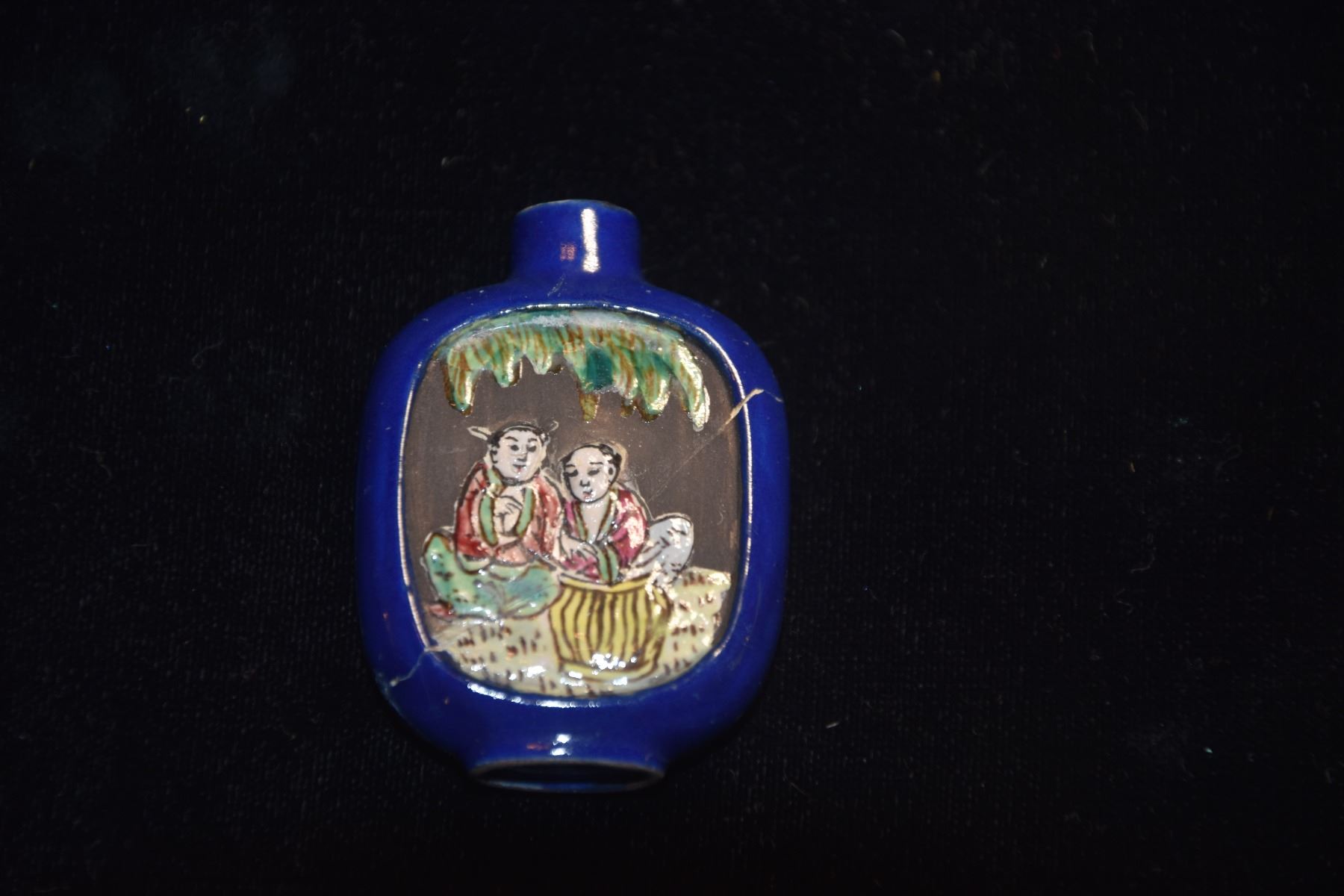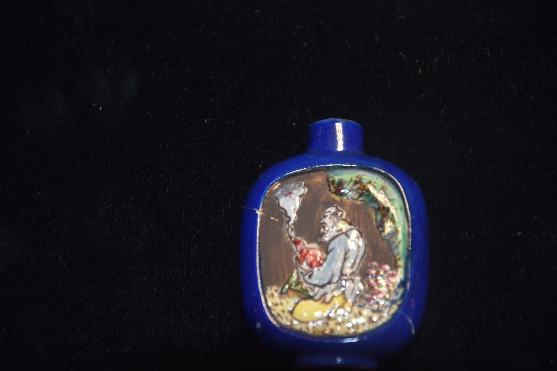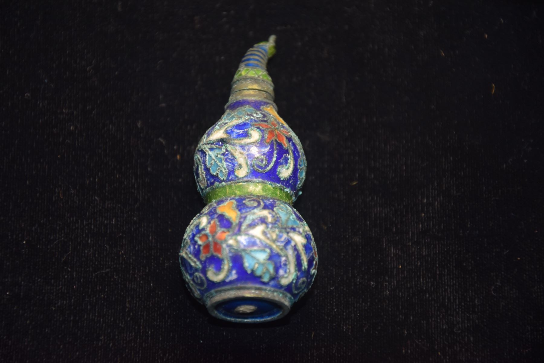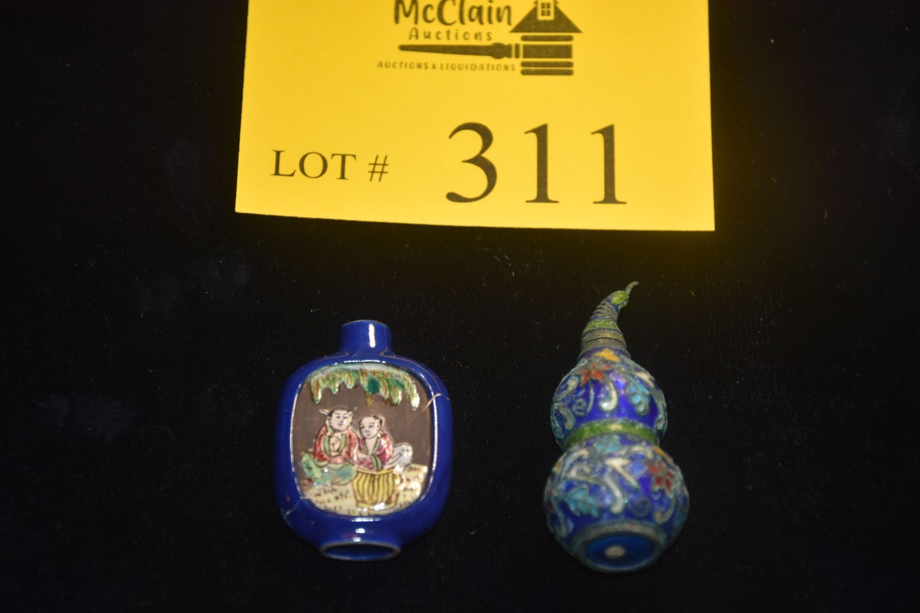 CHINESE SNUFF BOTTLES, BLUE GOURD CLOISONNE & BLUE CERAMIC CARTOUCHE (2 PCS)