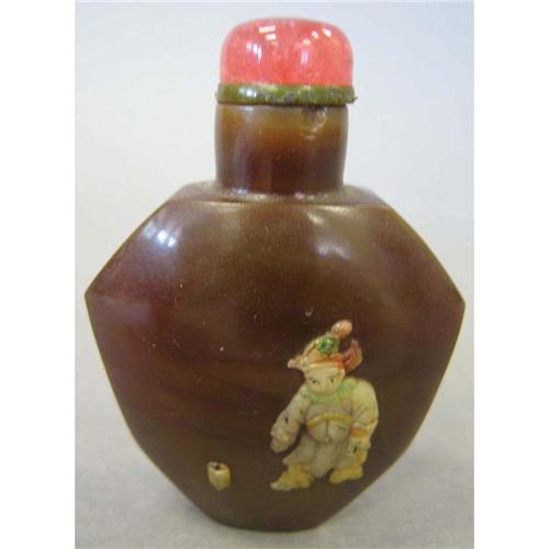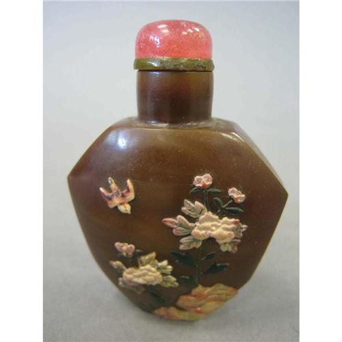 CHINESE SOAP STONE SNUFF BOTTLE with carved jade decoration height: 3"