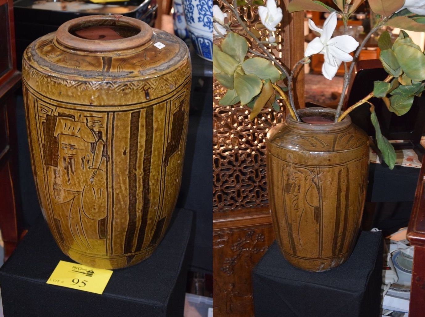 CHINESE STONEWARE STORAGE JARS (16.5" H) (DOES NOT INCLUDE FLOWERS)