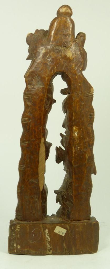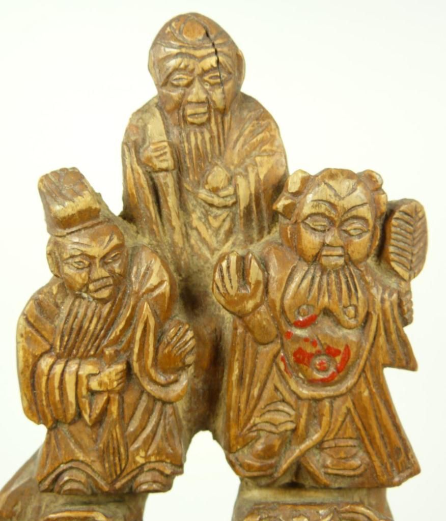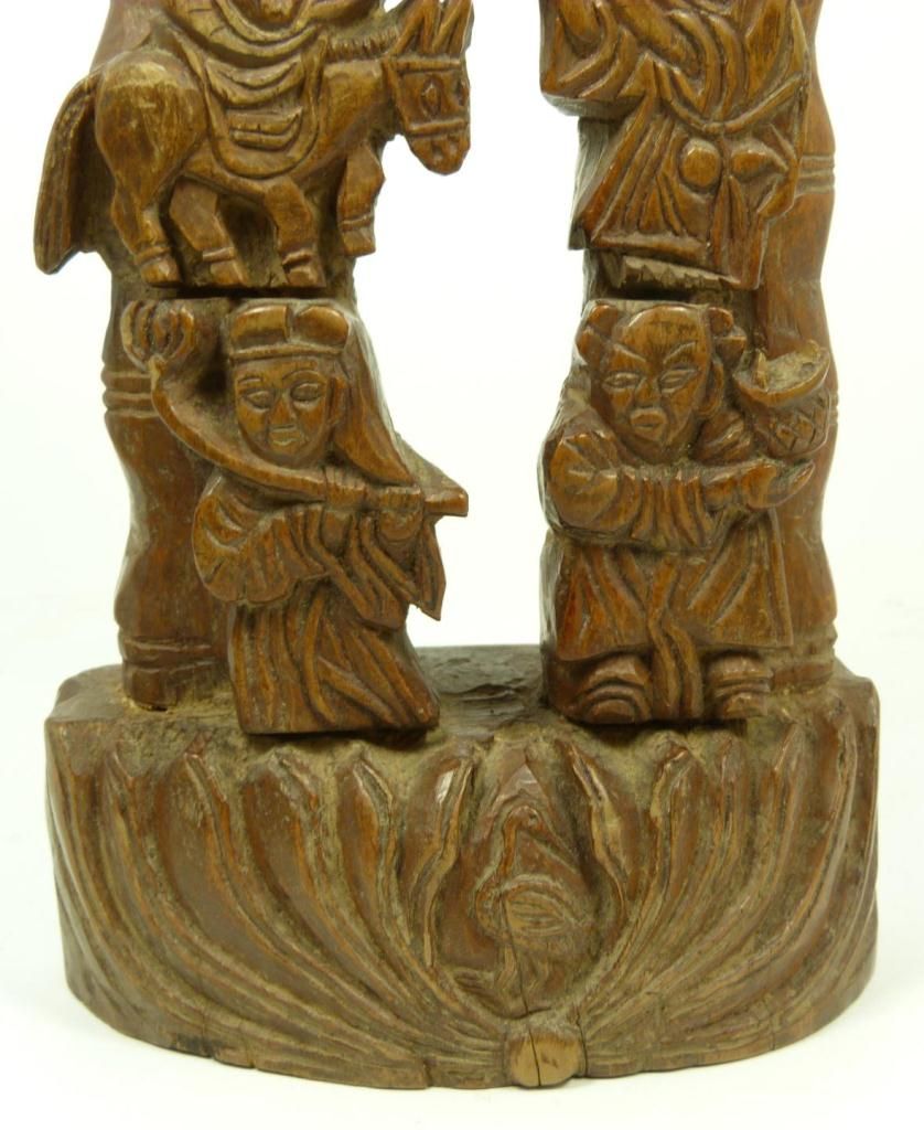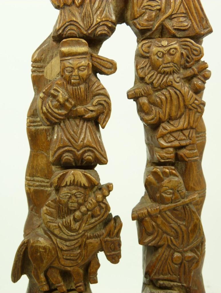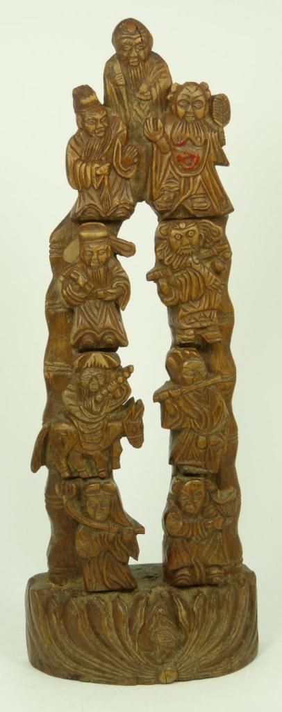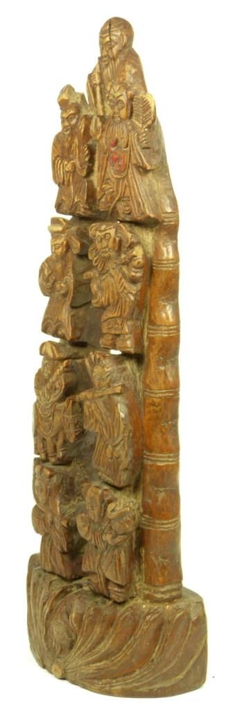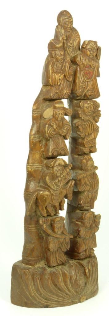 Antique Chinese Qing Dynasty period relief carved wooden Tongzhi sculpture depicting immortals. Fully relief carved depicting nine figures over stylized lotus blossom form with crane base. Tongzhi period (1862-1874) Measures 13 3/4" height (33.6cm). Total weight of 593 grams.