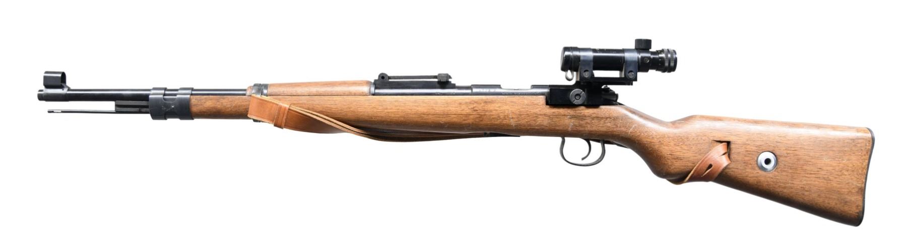 Cal. 22 LR. S# 9305151. Bbl. 20 1/2". Blade front sight with German-style hood. Tangent rear sight graduated to 200m. Receiver-mounted Chinese 2.75x18 scope; the scope has a front rubber eyepiece, a duplex crosshair reticle, and very good optics. Receiver top is also grooved for additional scope mounting. Chinese-made Mauser-style training rifle that resembles the WWII German KKW. Matching number on cocking piece. Left side of the receiver has a Navy Arms import marking. Blued finish. Hardwood pistol grip stock with left side sling provisions and tan sling. MAGS: One 5-rd. CONDITION: stock shows some scattered moderate flaking, dings, and handling marks. Metal retains 95% of its original blue, with some edge wear, handling marks, and light oxidation on the rear band. Action functions properly when hand-cycled. Bright, near-excellent bore. (24-7147/MJC). MODERN. $200-400.