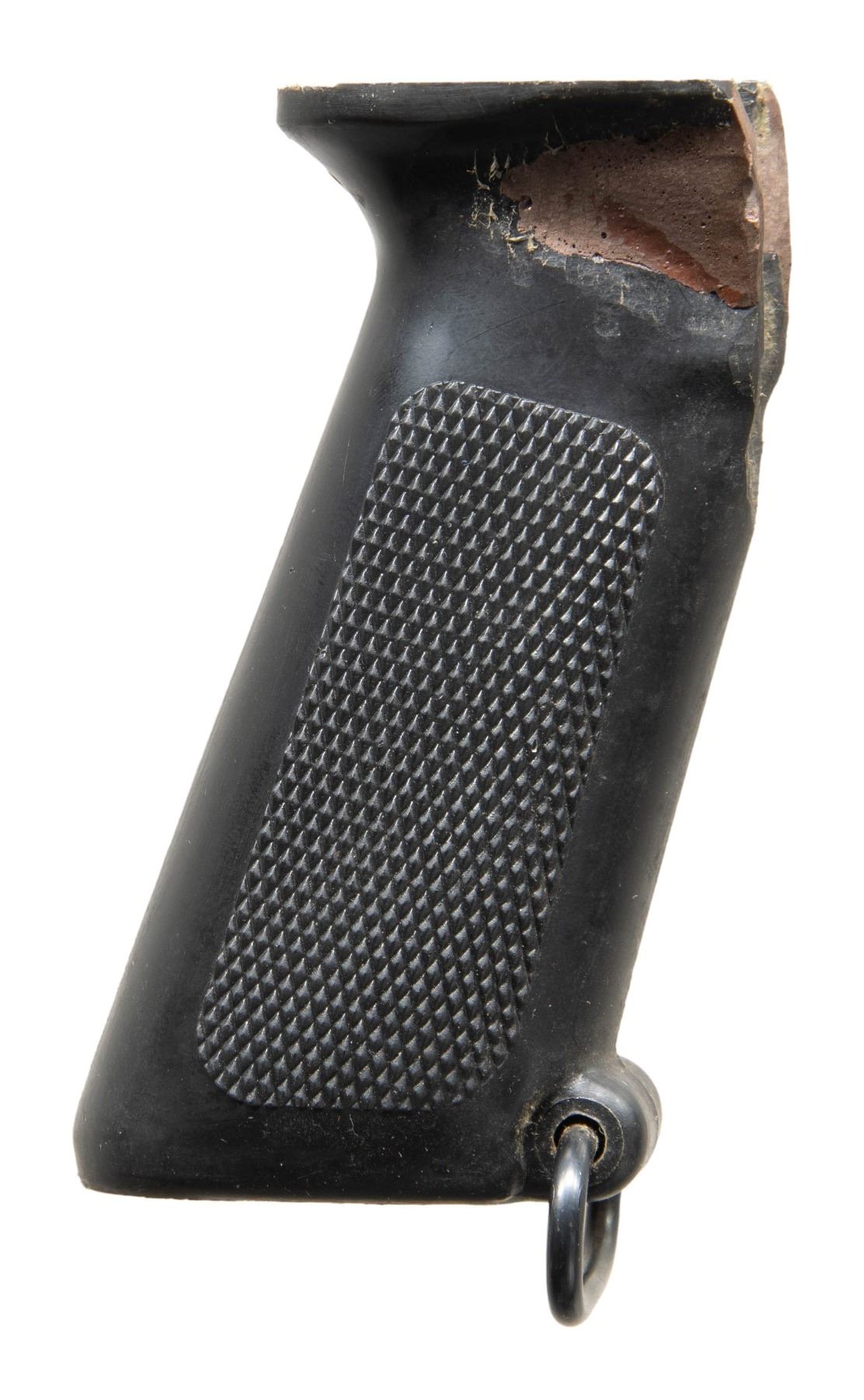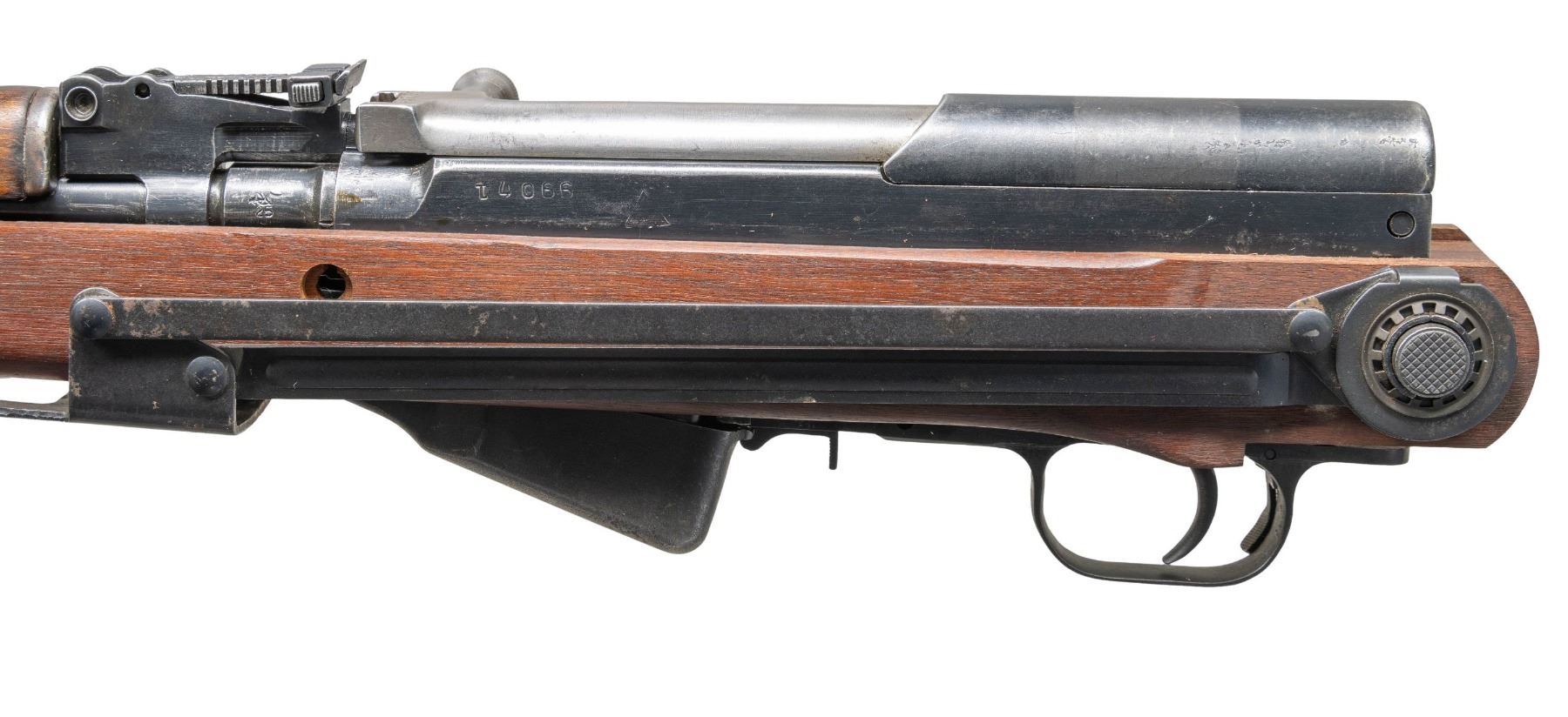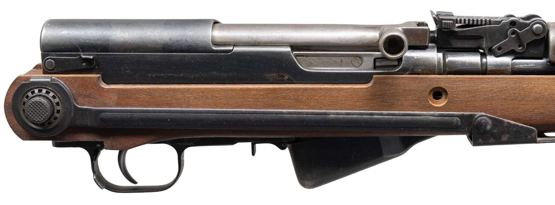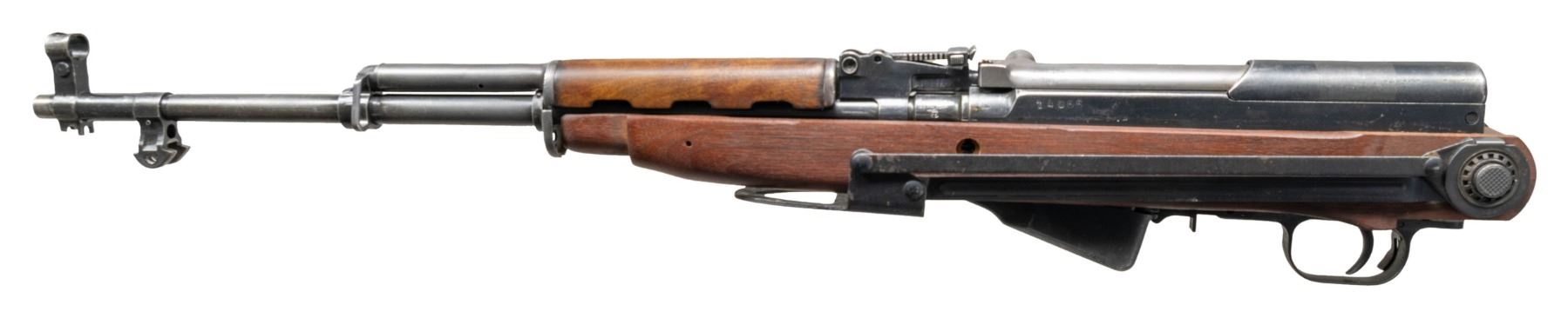 Cal. 7.62x39. S# L4066. Bbl. 20 1/2" with Century import marking. Post front sight with hood. Tangent rear sight graduated to 1000m. Bolt is mismatched but other visible parts are matching. Rifle appears to be an early Chinese military example with "Triangle 26" arsenal marking. Blued finish. Aftermarket hardwood folding stock. AR-15 style pistol grip present that has broken off. No bayonet or stock crossbolt assembly present. UNATTACHED ACCESSORIES: unmarked white box. CONDITION: stock is loose due to missing crossbolt, it shows scattered flaking, dings & handling marks. Metal parts of stock show scattered oxidation patches. Balance of metal shows overall thinning to gray, edge wear, scattered oxidation, handling marks & light pitting. Action functions properly when hand cycled. Very good bright bore. (25-2824/MJC). MODERN. $250-350.