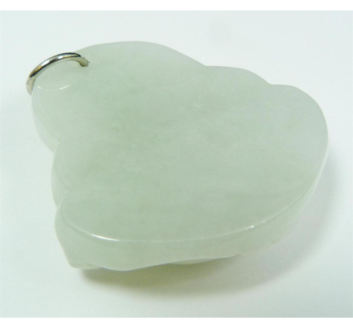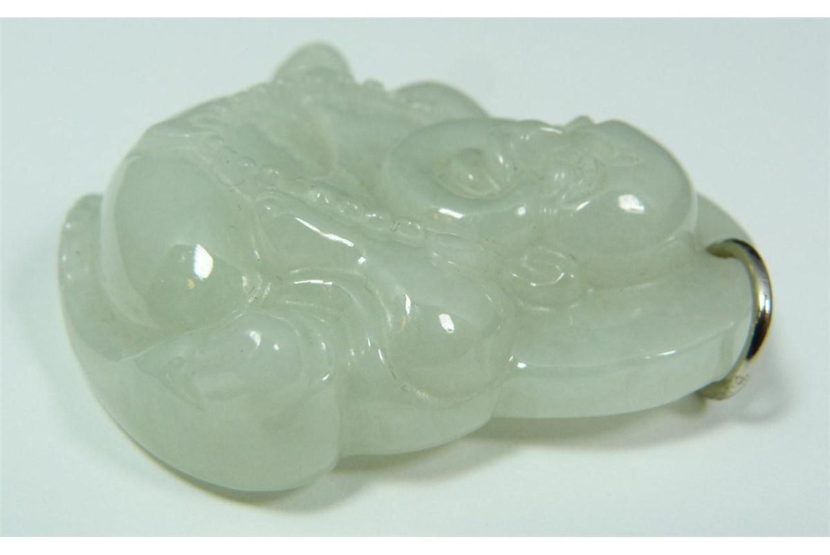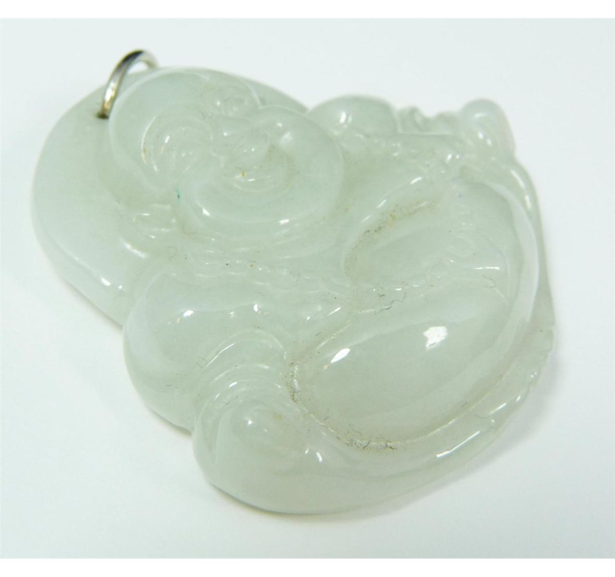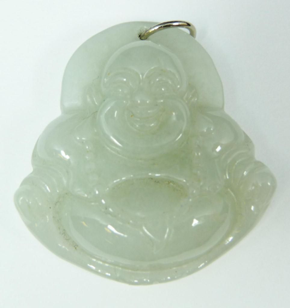 Chinese carved white mottled jadeite laughing seated Buddha pendant. Measures 1 3/4" height x 1 3/4" width (4.4cm x 4.4cm). Total weight of 21.8dwt.