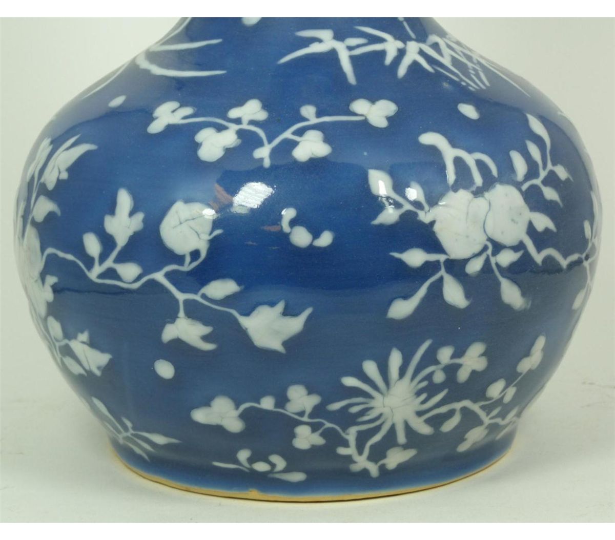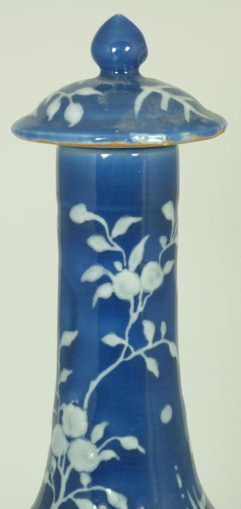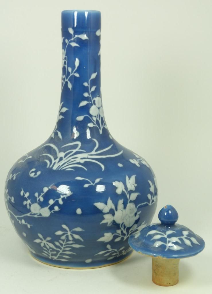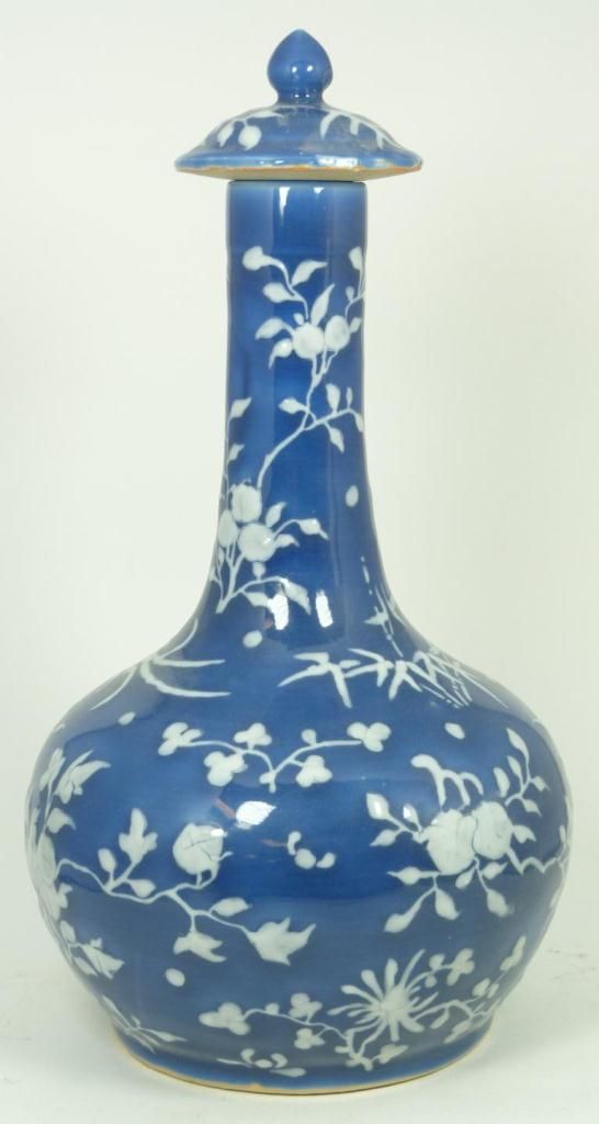 Antique Chinese Qing Dynasty period white on blue porcelain bottle form vase having matching lid. Floral designs throughout. Qing dynasty period. Measures 15 3/4" height (40cm). Total weight of 2146 grams.