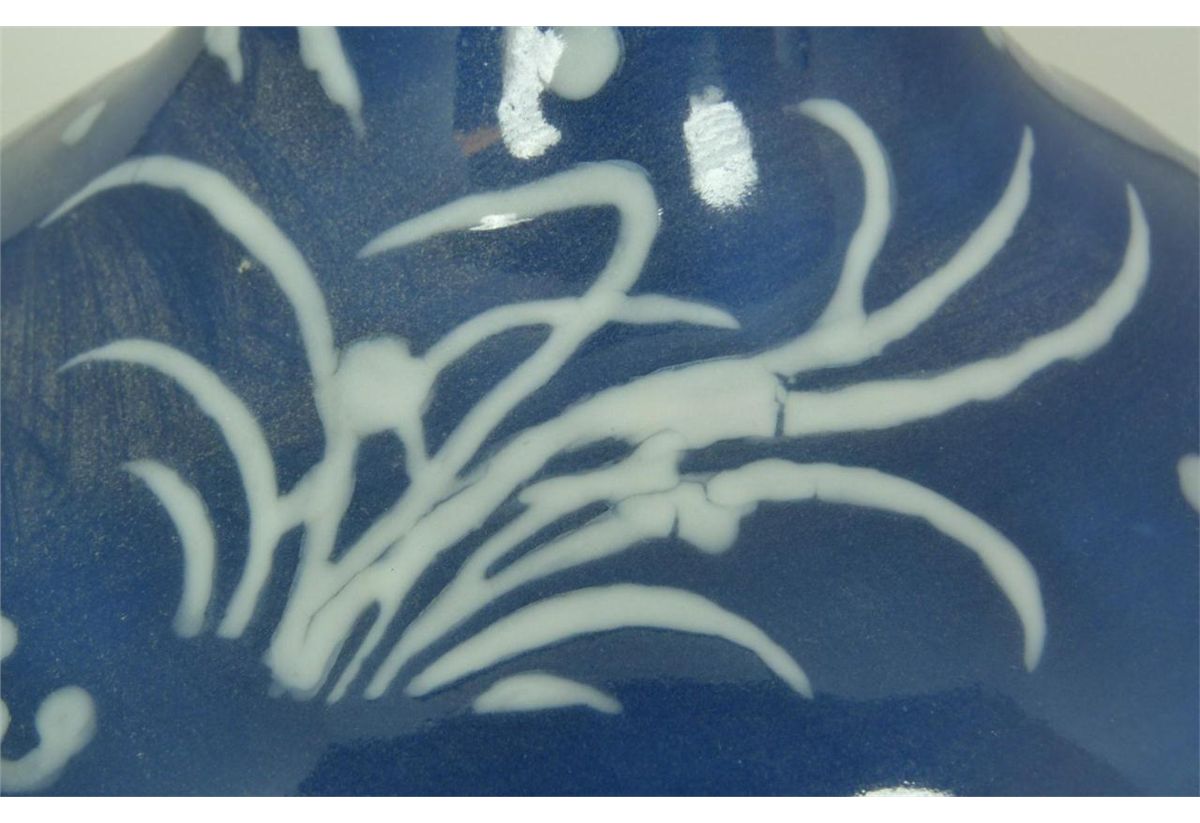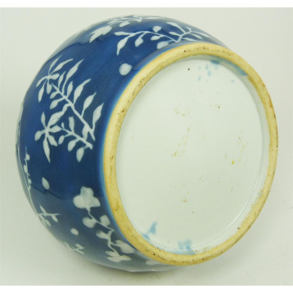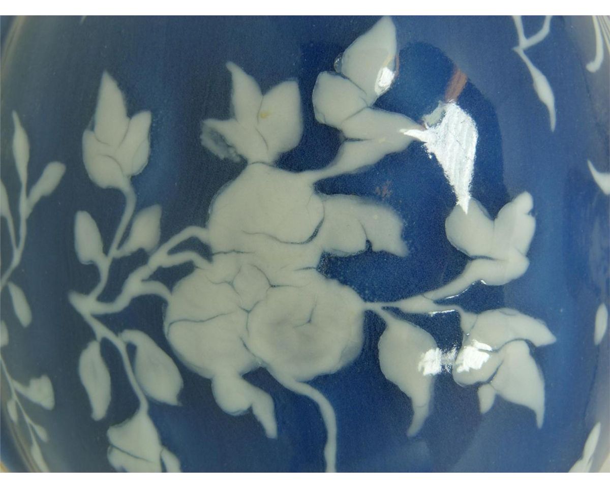 Antique Chinese Qing Dynasty period white on blue porcelain bottle form vase having matching lid. Floral designs throughout. Qing dynasty period. Measures 15 3/4" height (40cm). Total weight of 2146 grams.