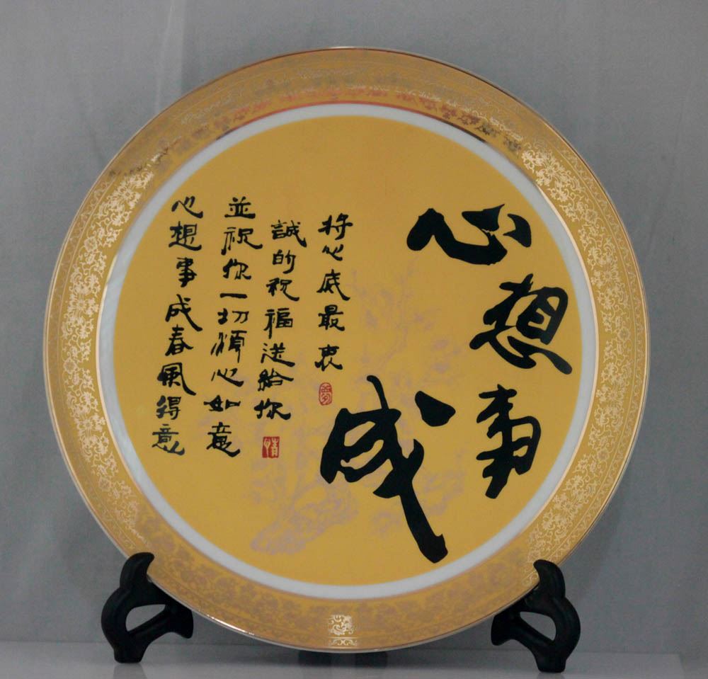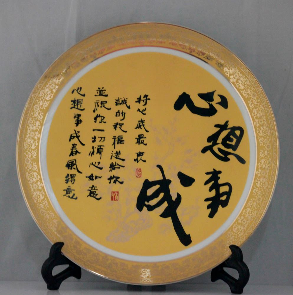CHINESE WRITING DESIGN PORCELAIN PLATE W/STAND **|**|** CHINESE WRITING DESIGN PORCELAIN PLATE W/STAND