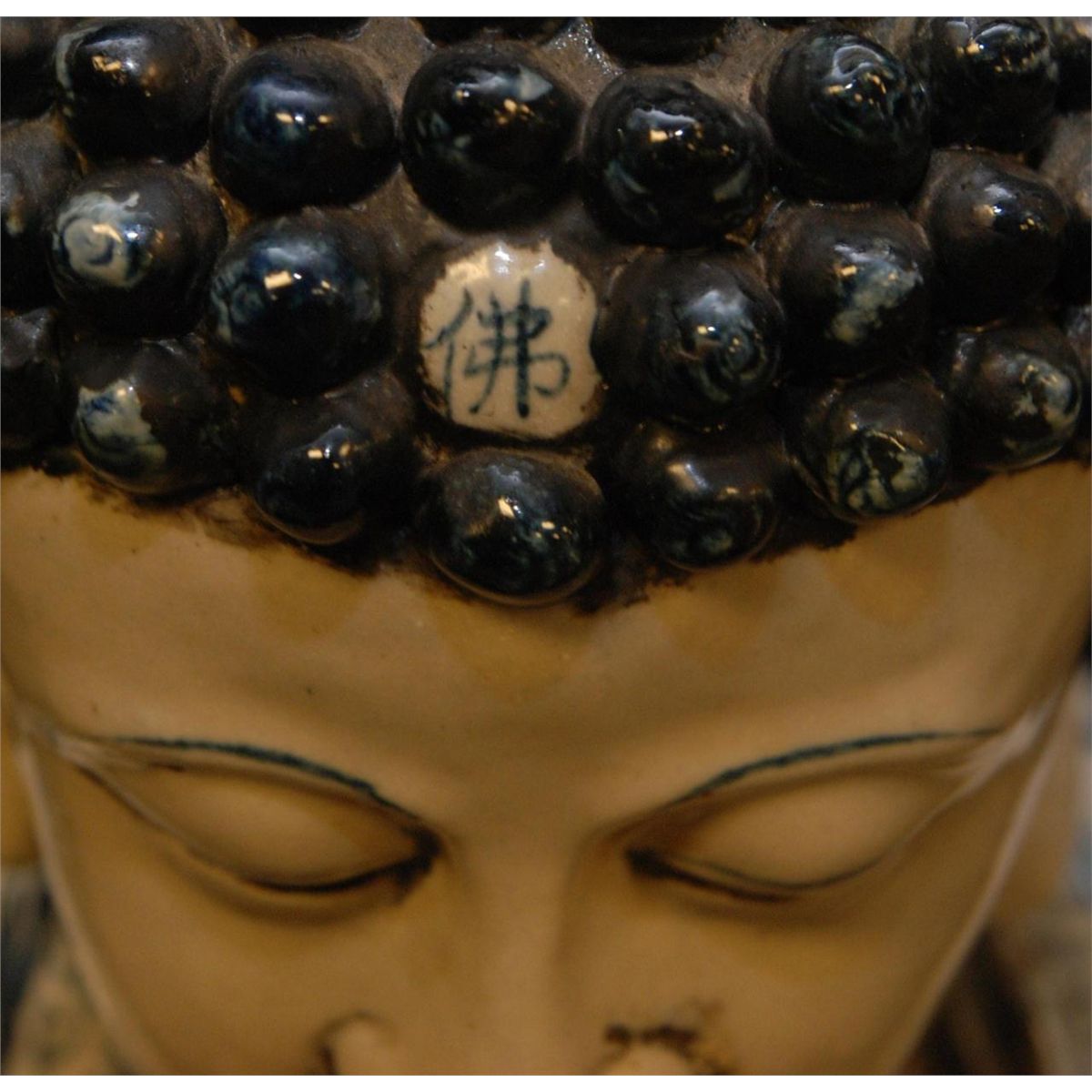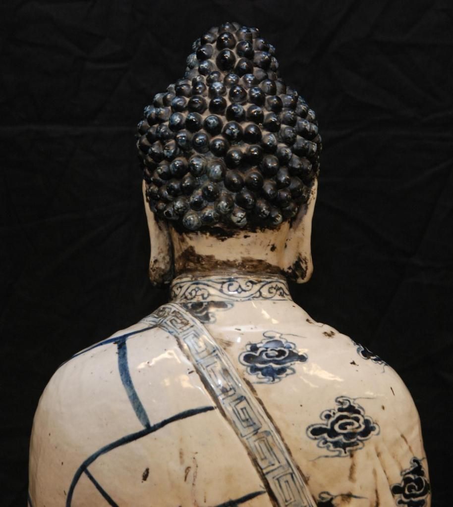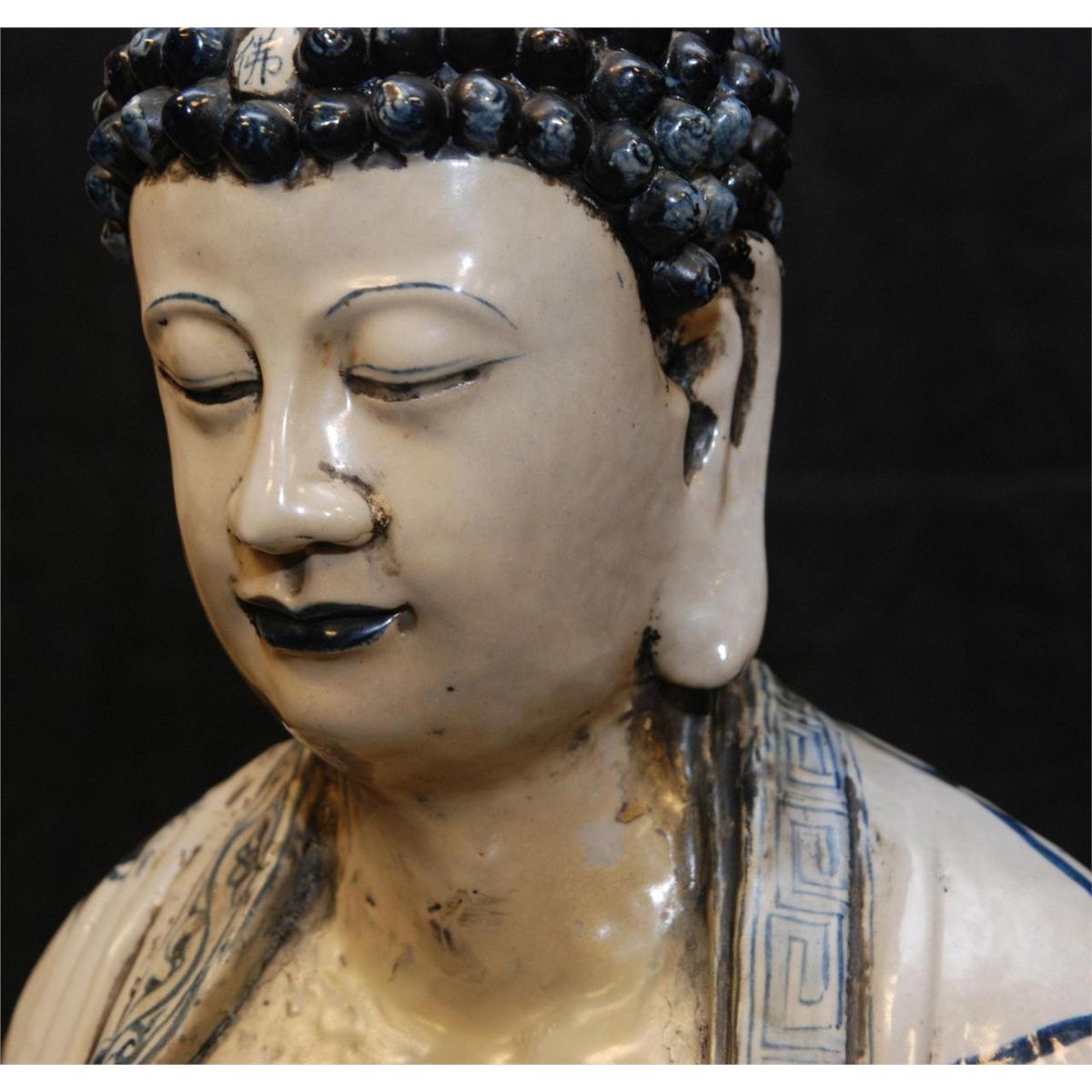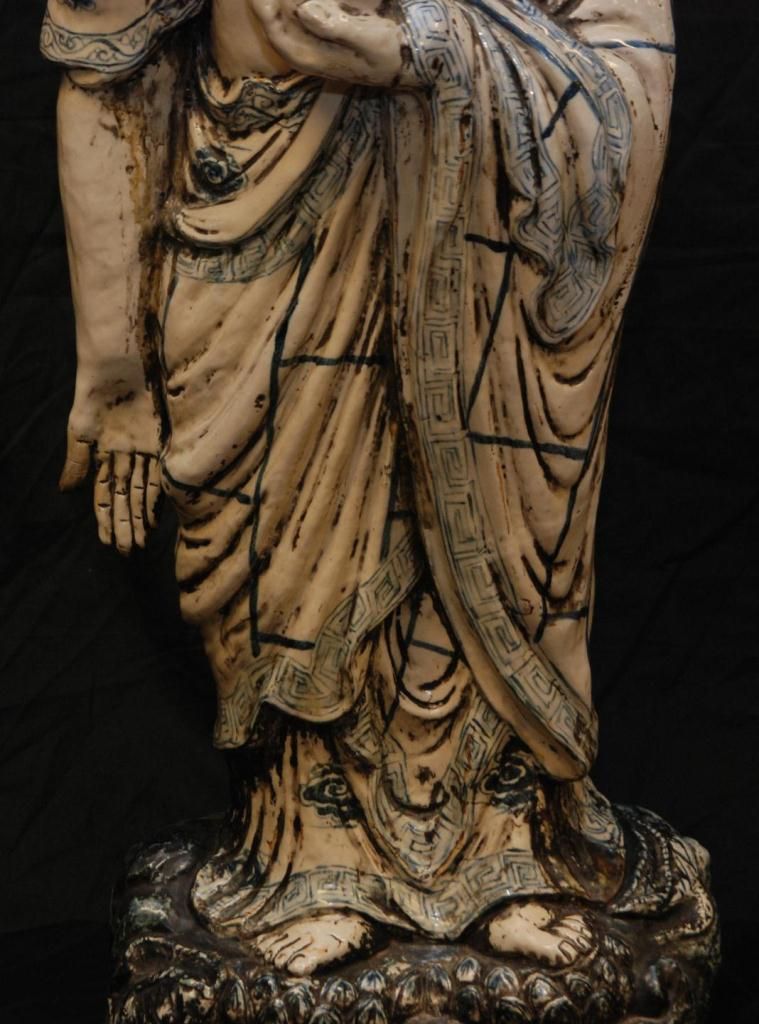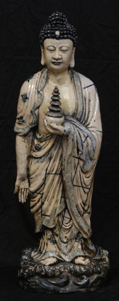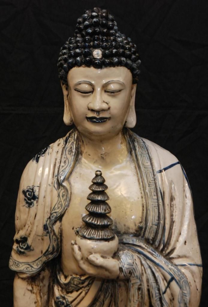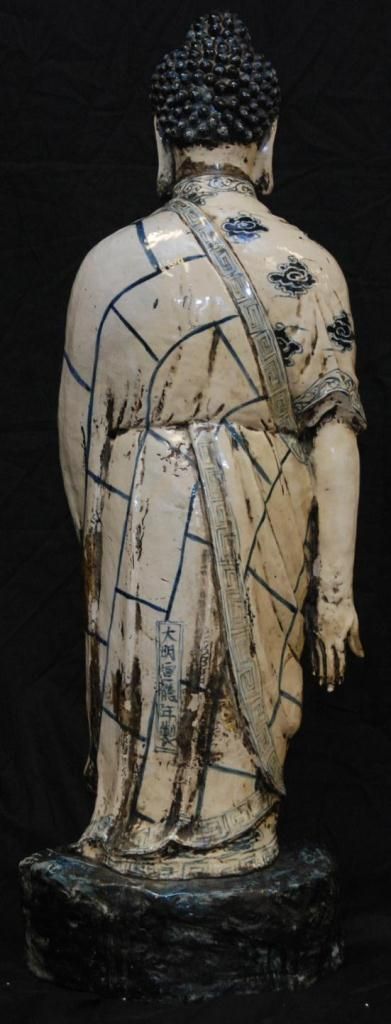 19th century palatial Chinese Qing dynasty hand painted blue and white porcelain Ming style sculpture depicting a standing Buddha figure in flowing robe holding a small pagoda structure to front. Holds six character Ming dynasty marks to verso, but made Xianfeng (1851-1861) period. Measures 42 1/2" height (107.9cm). Includes certificate of authenticity.