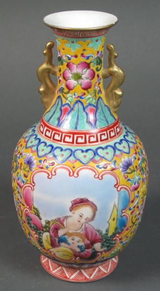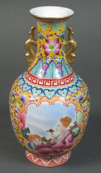 -double handled, with polychrome decorated exterior featuring two pictorial medallions. Marked to base.
