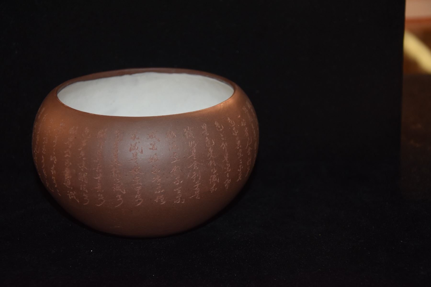 CHINESE YIXING BOWL, ETCHED ALL AROUND W/CALLIGRAPHY (LOTUS SUTRA INSCRIBED) (6 1/2" X 6") (DOES NO