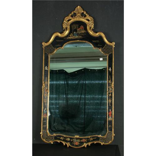 CHINOISERIE MIRROR: A Carver's Guild mirror in the chinoiserie and modified chippendale styles, gold edged filigree, outlining the mirror with black background in Chinoiserie design with a narrow gold trim, modern, 24'' W x 47'' H. good condition